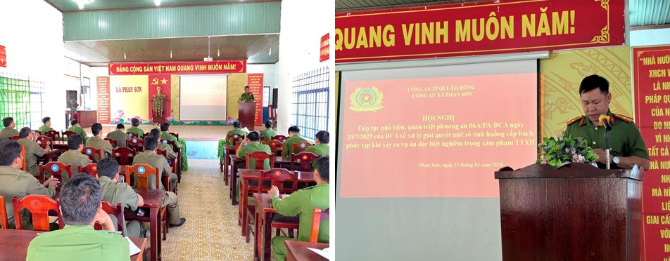 Hội nghị triển khai Phương án của Bộ Công an về xử lý, giải quyết một số tình huống cấp bách, phức tạp khi xảy ra vụ án đặc biệt nghiêm trọng xâm phạm trật tự xã hội. Tham dự có lãnh đạo, cán bộ, chiến sĩ Công an xã cùng lực lượng tham gia bảo đảm an ninh, trật tự ở cơ sở.