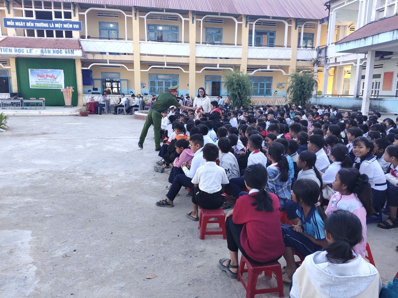 Cán bộ Công an xã tuyên truyền pháp luật cho các em học sinh