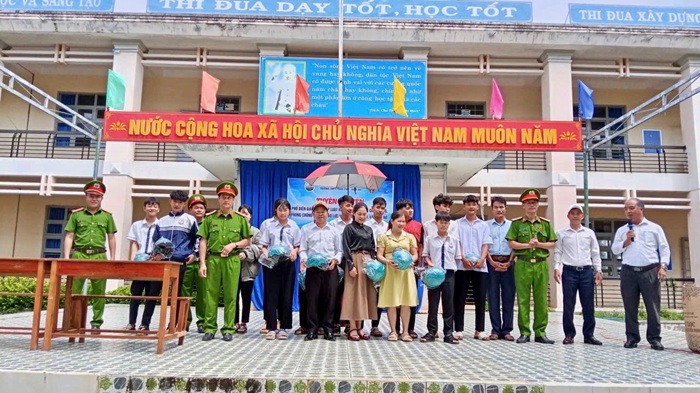 Kết thúc buổi tuyên truyền, Công an xã đã trao tặng 30 phần quà là mũ bảo hiểm cho cán bộ, giáo viên và học sinh tham gia giao lưu hỏi đáp trực tiếp và đại diện các lớp học trong nhà trường.