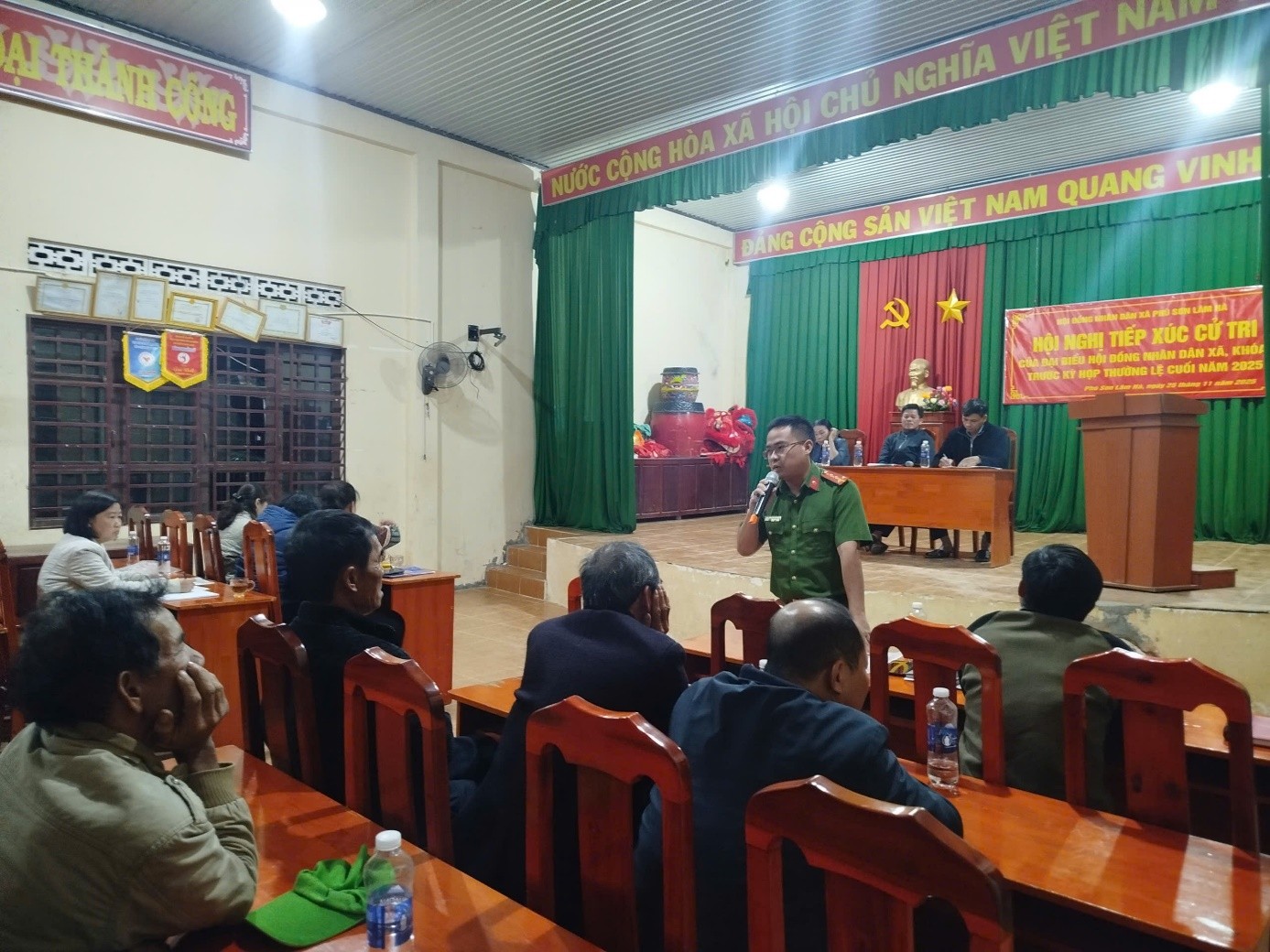 Song song với phần tiếp xúc cử tri, đồng chí Trưởng Công an xã đã tuyên truyền nhiều nội dung quan trọng nhằm bảo đảm an ninh trật tự và hỗ trợ bà con trong mùa thu hoạch cà phê, gồm: