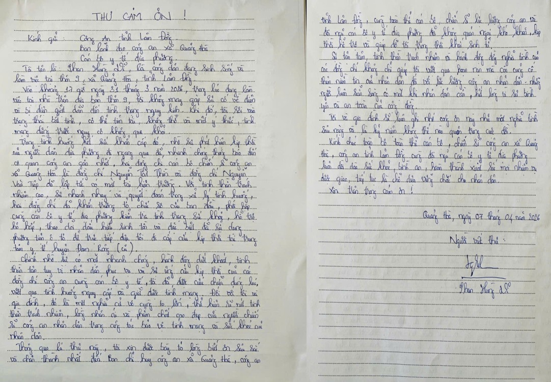 Trong thư cảm ơn gửi đến Công an xã Quảng Hòa, anh Phan Hùng Vĩ bày tỏ sự cảm kích sâu sắc trước tinh thần trách nhiệm, sự tận tình của hai cán bộ Công an xã đã giúp anh thoát khỏi nguy hiểm.