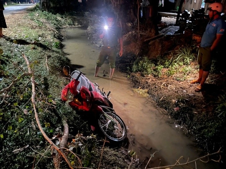 Tổ tuần tra đã nhanh chóng tiếp cận hiện trường, phát hiện một xe máy rơi xuống mương nước bên đường, nạn nhân nằm úp mặt dưới nước trong tình trạng bất tỉnh. Xác định đây là vụ tai nạn tự ngã do trời tối, lực lượng Công an đã lập tức xuống mương đưa nạn nhân lên khỏi mặt nước, tiến hành sơ cứu ban đầu.