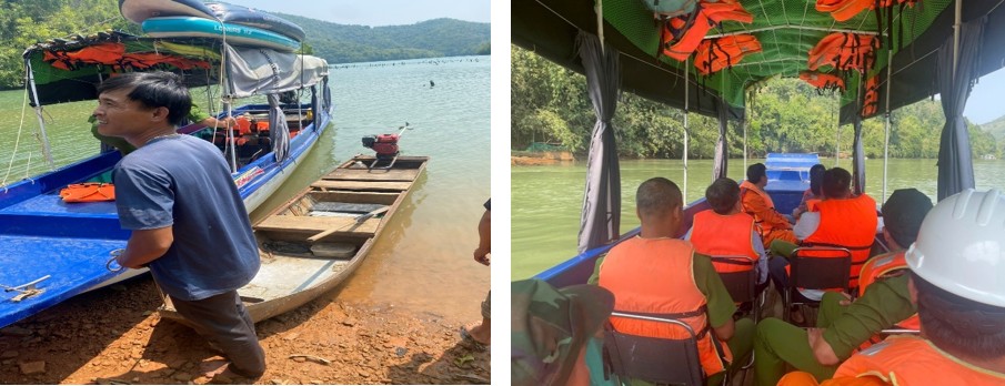 Các lực lượng chức năng xã Quảng Khê sử dụng phương tiện đường thủy tiếp cận các hộ dân để kiểm tra cư trú trên lòng hồ