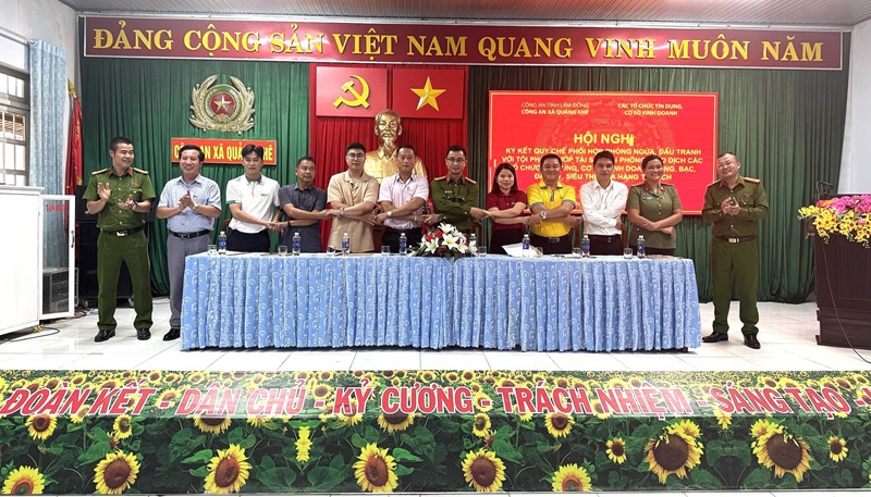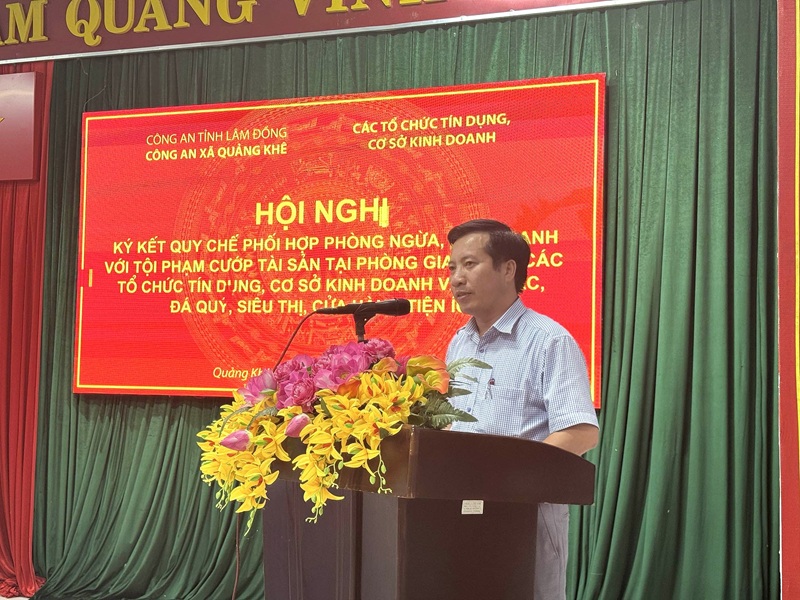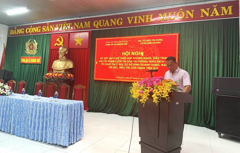 Chiều ngày 05/9/2025, thực hiện chỉ đạo của Lãnh đạo Công an tỉnh Lâm Đồng, Công an xã Quảng Khê đã phối hợp cùng các tổ chức tín dụng, cơ sở kinh doanh trên địa bàn tổ chức “Hội nghị ký kết Quy chế phối hợp phòng ngừa, đấu tranh với tội phạm cướp tài sản”. Đến dự và chỉ đạo Hội nghị có đồng chí Tạ Đình Hải – Phó Bí thư Thường trực Đảng ủy xã, cùng sự tham dự của tập thể chỉ huy Công an xã và đại diện các tổ chức tín dụng, cơ sở kinh doanh.