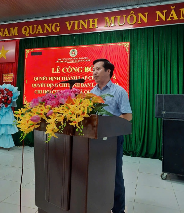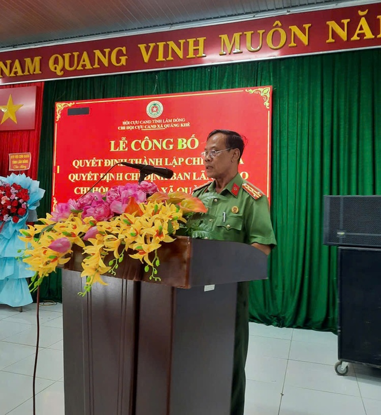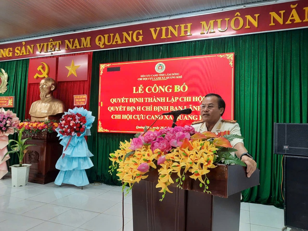 Tại buổi lễ, đồng chí Đại tá K’Sớ – Phó Chủ tịch Hội Cựu Công an nhân dân tỉnh Lâm Đồng đã công bố và trao Quyết định thành lập Chi hội Cựu Công an nhân dân xã Quảng Khê, gồm 28 hội viên, là những cán bộ, chiến sĩ Công an đã nghỉ hưu, chuyển ngành hoặc hoàn thành nhiệm vụ, hiện sinh sống trên địa bàn xã. Đồng thời, đồng chí cũng trao Quyết định chỉ định Ban lãnh đạo Chi hội lâm thời, gồm 5 đồng chí: