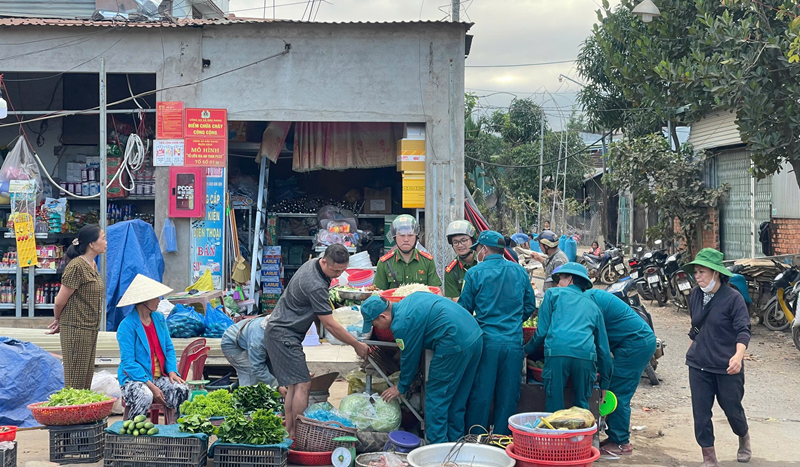 Các lực lượng phối hợp hỗ trợ di chuyển sạp, bàn bày bán ven đường