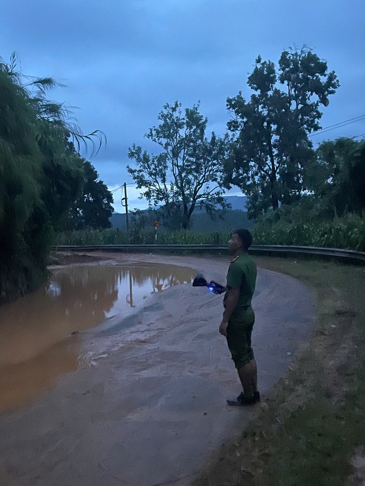 Ngay từ sáng sớm, Công an xã Sơn Điền đã huy động lực lượng, phối hợp cùng dân quân tự vệ và người dân địa phương tổ chức dọn dẹp đất đá, cây cối bị đổ chắn ngang đường, kịp thời thông tuyến giao thông. Lực lượng Công an cũng bố trí cán bộ trực tiếp điều tiết, phân luồng và hướng dẫn phương tiện lưu thông an toàn qua khu vực bị ảnh hưởng.