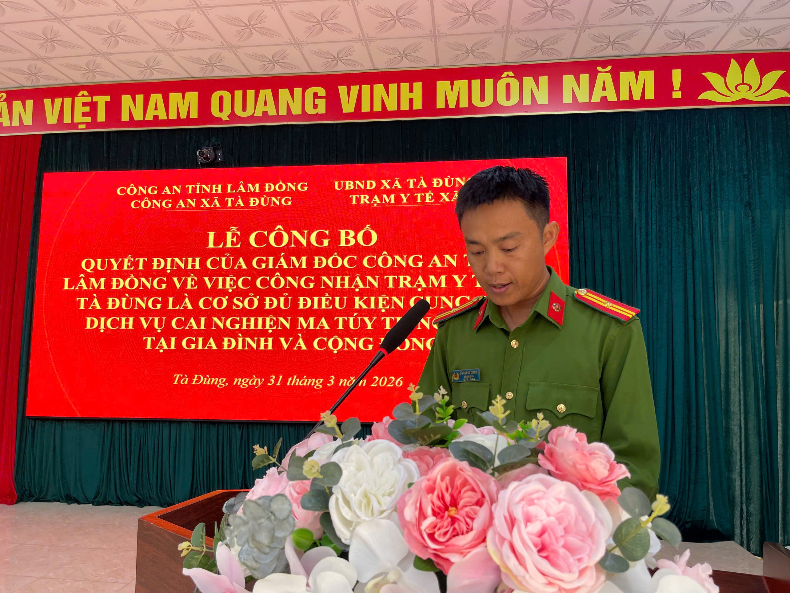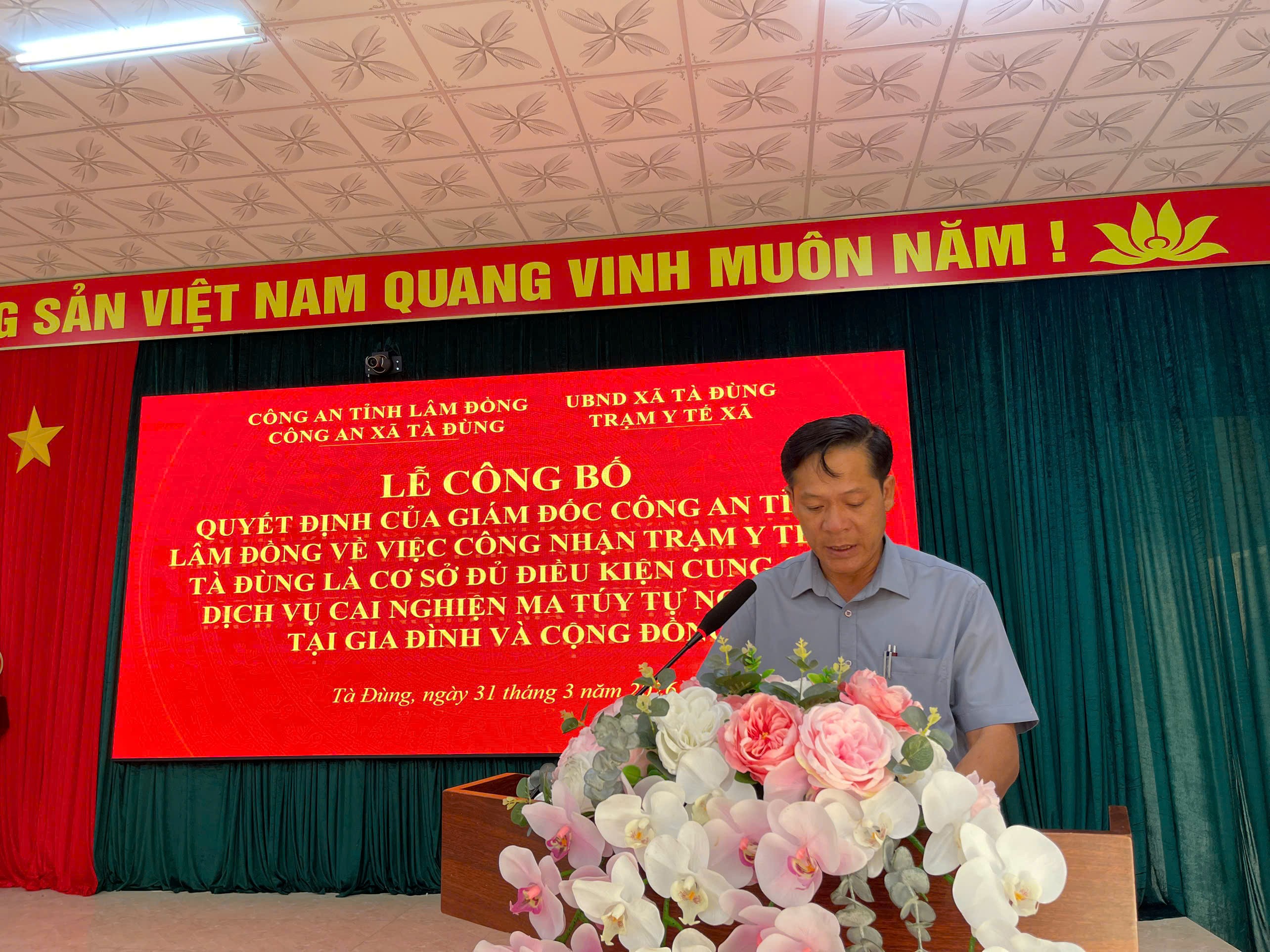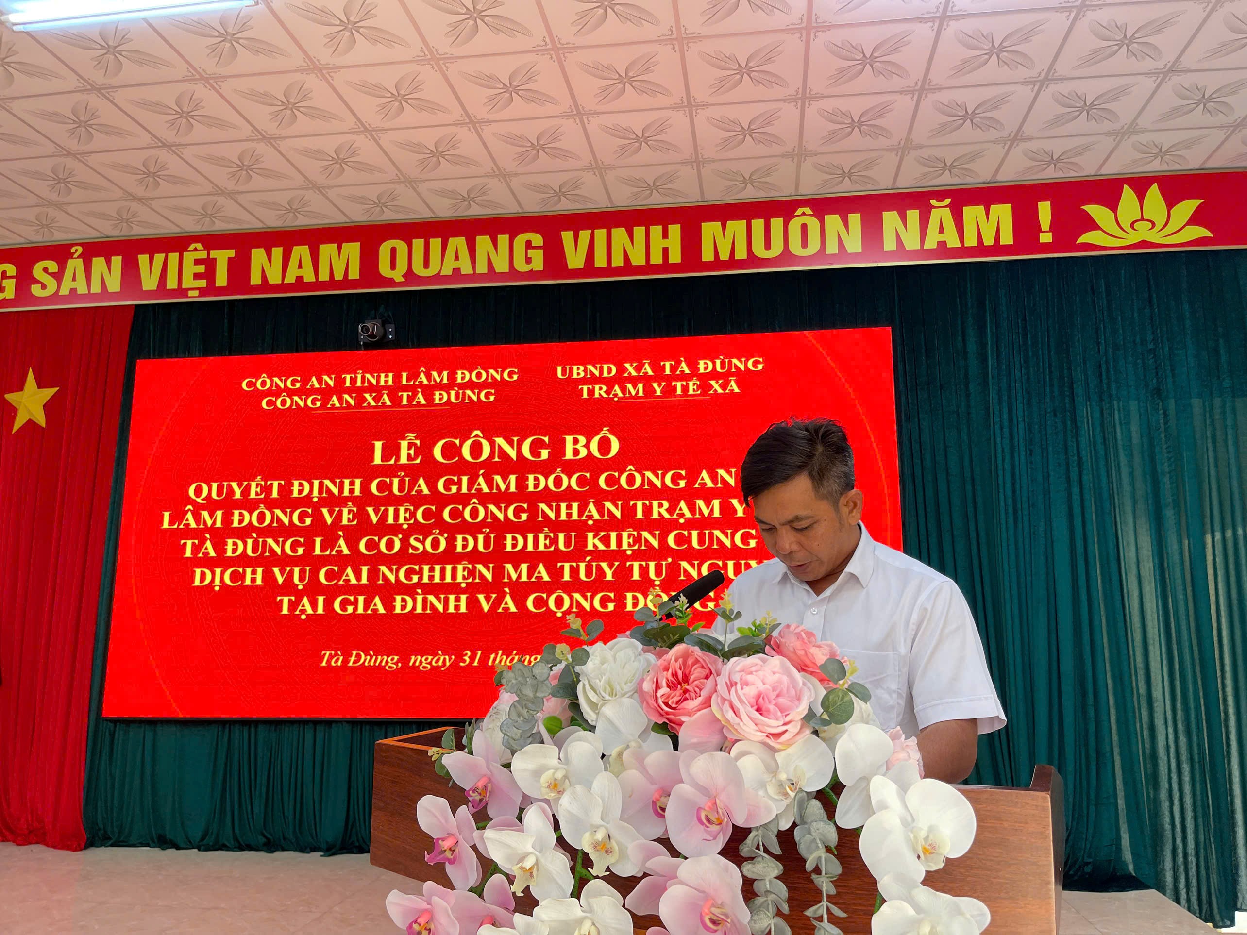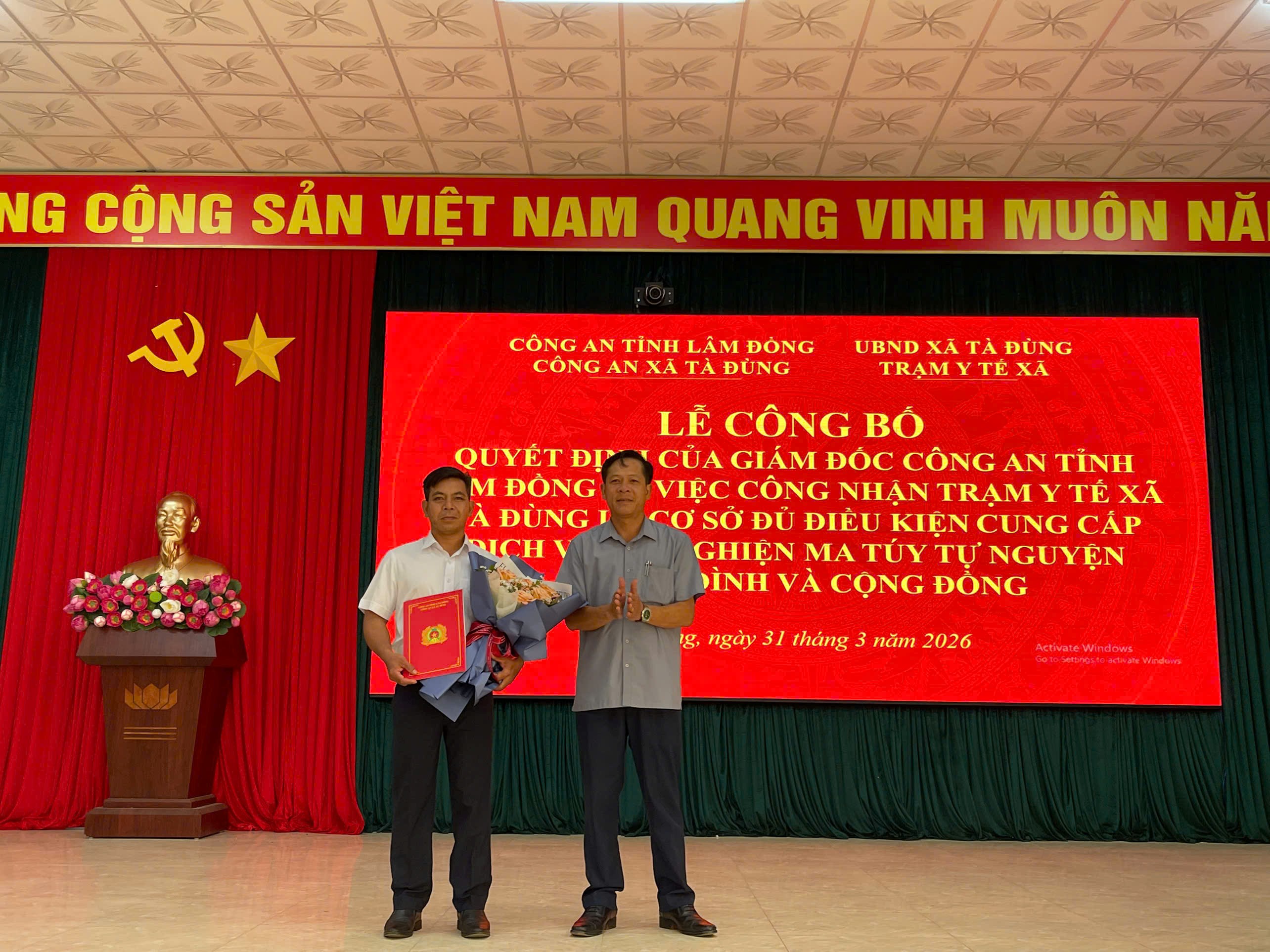 Tại buổi lễ, đại diện UBND xã đã trao Quyết định công nhận Trạm Y tế xã Tà Đùng là cơ sở đủ điều kiện cung cấp dịch vụ cai nghiện ma túy tự nguyện tại gia đình và cộng đồng. Việc công nhận này tạo điều kiện để địa phương chủ động triển khai các biện pháp tư vấn, điều trị, hỗ trợ và quản lý người nghiện ma túy, góp phần nâng cao hiệu quả công tác phòng, chống ma túy tại cơ sở.