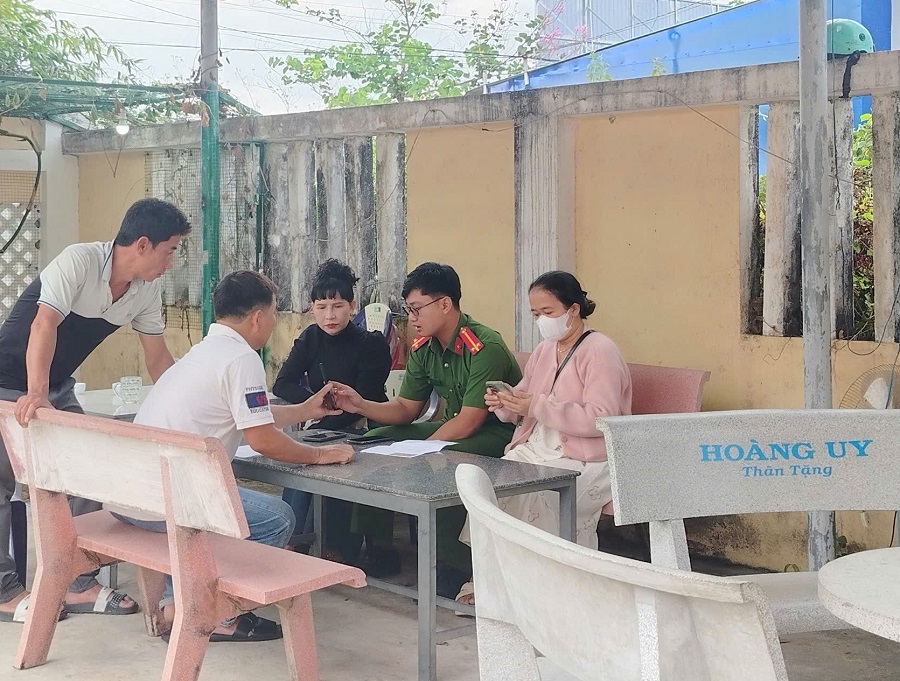 Cán bộ Công an xã Tân Hải hướng dẫn phụ huynh cài đặt ứng dụng VNeID tại trụ sở Công an xã