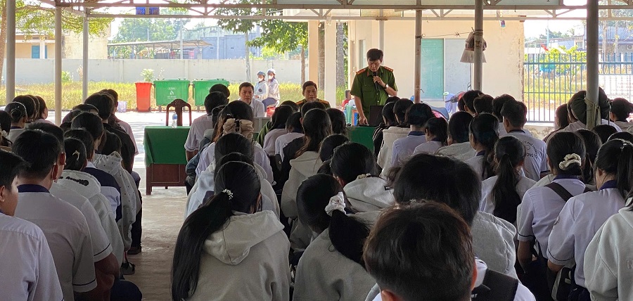 Đại diện Công an xã hướng dẫn, giải đáp các thắc mắc và tư vấn cho các em học sinh lớp 12 Trường THPT Nguyễn Trường Tộ
