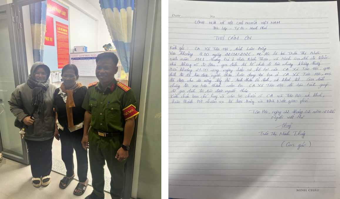 Trong thư, chị Thủy bày tỏ: “Mẹ tôi đã được các anh Công an cho ăn uống đầy đủ, tinh thần ổn định, sức khỏe tốt. Gia đình chúng tôi xin chân thành cảm ơn Công an xã Tân Hội đã tận tình giúp đỡ gia đình tôi tìm được người thân. Kính chúc Ban chỉ huy và toàn thể cán bộ, chiến sĩ luôn hoàn thành tốt nhiệm vụ được Đảng, Nhà nước giao phó và dồi dào sức khỏe.”