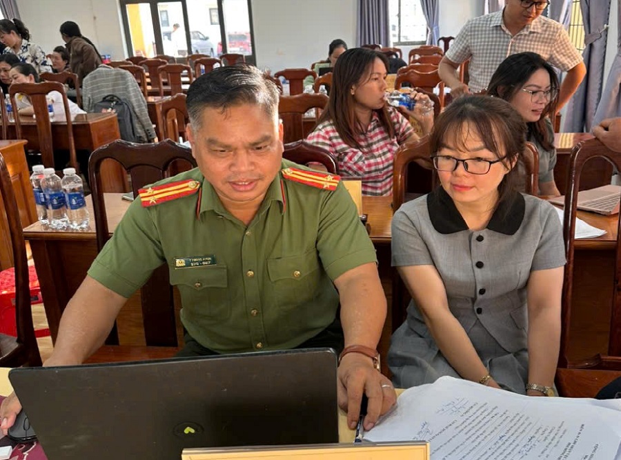 Cán bộ Công an xã Thuận An cài đặt và hướng dẫn sử dụng phần mềm bảo đảm an ninh mạng, an toàn thông tin đối với máy tính phục vụ bầu cử