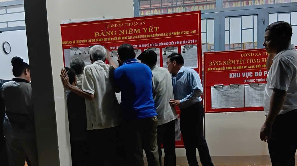 Công dân trên địa bàn xã Thuận An kiểm tra danh sách cử tri tại các điểm bỏ phiếu