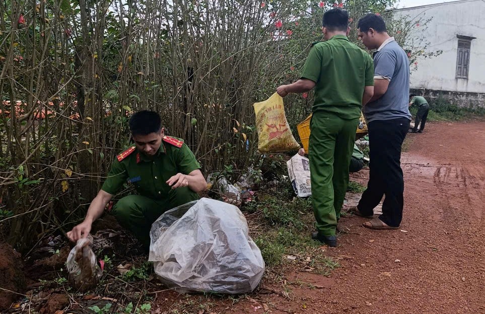 Đoàn thanh niên Công an xã cùng các tổ chức hội ở cơ sở thôn, bản tham gia dọn vệ sinh môi trường