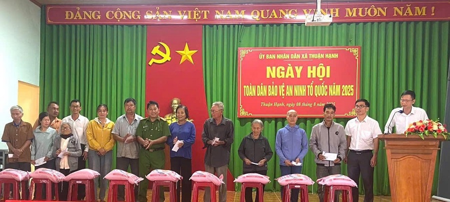 Công an xã Thuận Hạnh cùng lãnh đạo địa phương trao quà cho các hộ nghèo, người có công tại Ngày hội Toàn dân BVANTQ