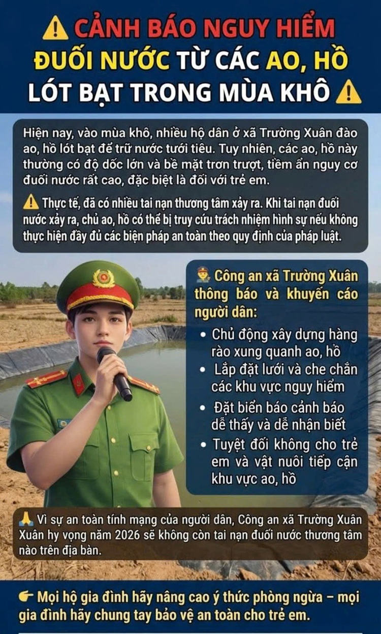 Công an xã Trường Xuân kêu gọi toàn thể nhân dân nâng cao ý thức, tích cực chung tay thực hiện các biện pháp phòng ngừa tai nạn đuối nước, góp phần bảo vệ an toàn tính mạng và tương lai của trẻ em trên địa bàn, nhất là trong mùa khô sắp tới.