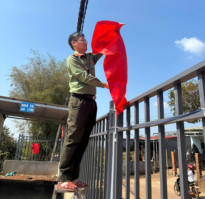 Cán bộ Công an xã khẩn trương triển khai việc treo cờ tuyên truyền tại trụ sở