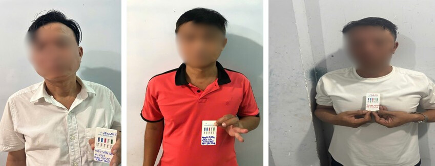 Đ/c Thiếu tá Đào Phước Mười Bảy (bên trái), Trung tá Hoàng Cao Cường (bên phải), Phó Trưởng Công an xã báo cáo tình hình ANTT và công tác quản lý hành chính
