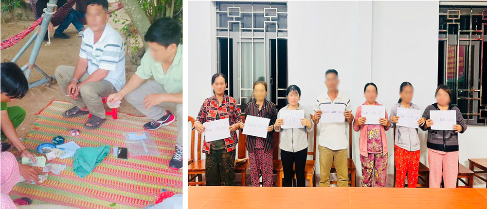 Lực lượng Công an nhanh chóng triển khai, bắt quả tang 08 đối tượng đang tụ tập đánh bài ăn tiền, gồm: Thung Quang Nam (SN 1973), Phạm Thị Về (SN 1968); Văn Thị Mâu (SN 1974); Võ Thị Loan (SN 1973); Nguyễn Thị Thu (SN 1960); Nguyễn Thị Yến (SN 1957); Võ Thị Hồng (SN 1966); Dương Thị Liễu (SN 1965) cùng thường trú tại xã Tuy Phong, tỉnh Lâm Đồng.