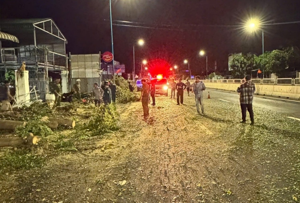Khi gió mạnh làm đổ nhiều cây lớn ra giữa đường quốc lộ, nguy cơ gây ách tắc giao thông, Công an xã đã nhanh chóng phối hợp với lực lượng Cảnh sát giao thông Công an tỉnh, dân quân, đoàn viên thanh niên và người dân địa phương triển khai cắt dọn cây đổ trong đêm.