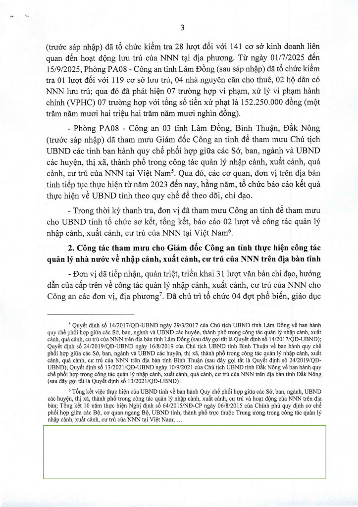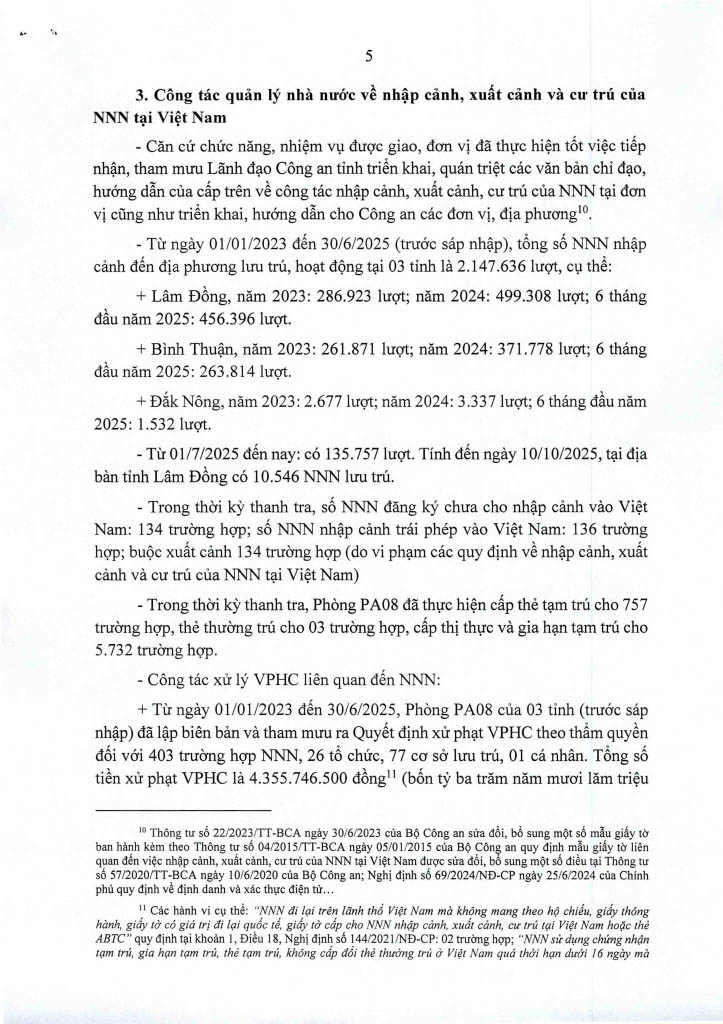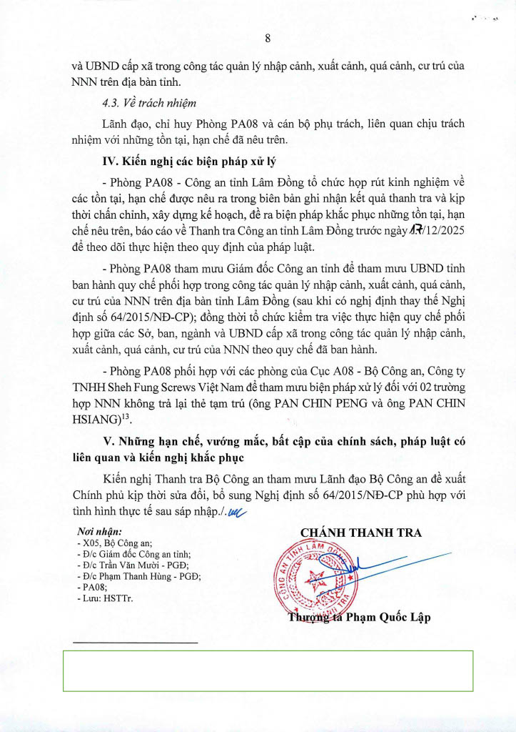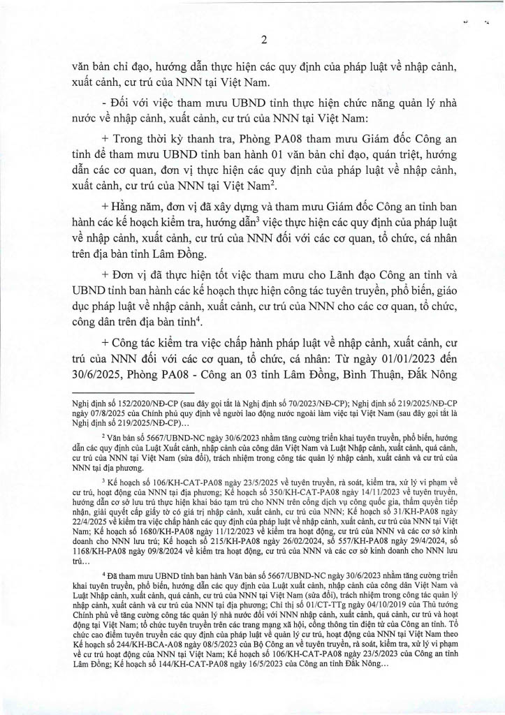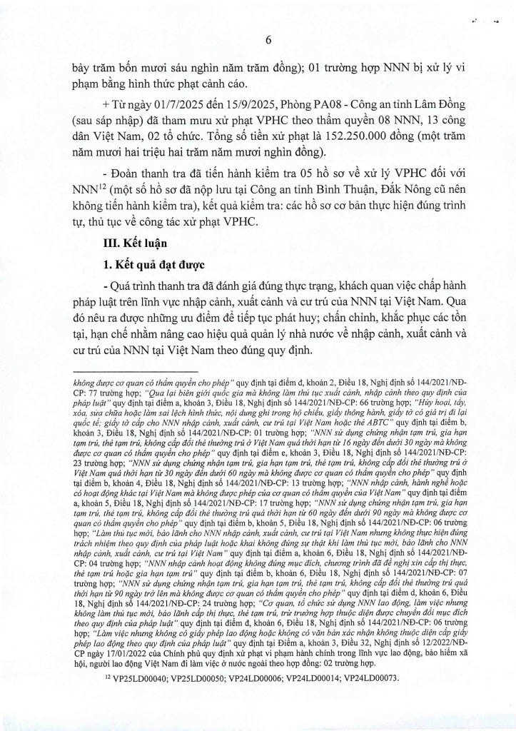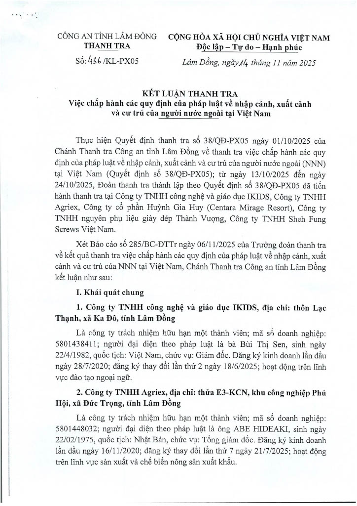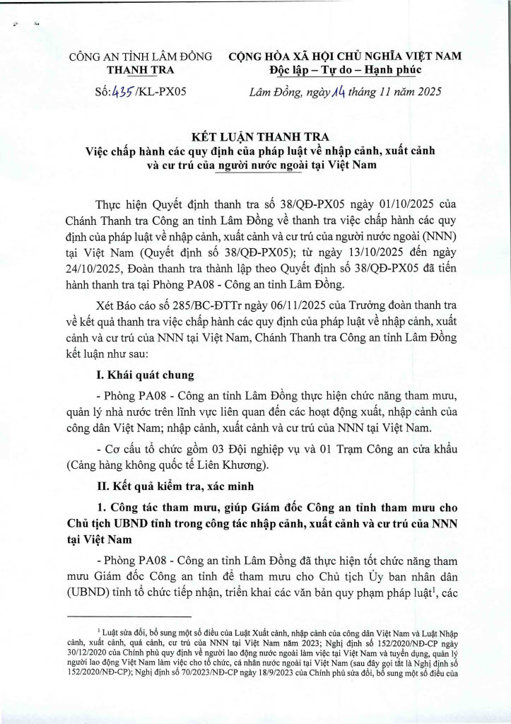 Ngày 14/11/2025, Thanh tra Công an tỉnh ban hanh 02 Kết luận thanh tra số 435/KL-PX05 và 436/KL-PX05 về thanh tra việc chấp hành các quy định của pháp luật về nhập cảnh, xuất cảnh và cư trú của người nước ngoài tại Việt Nam. Căn cứ Điều 37 Luật Thanh tra năm 2025 về công khai Kết luận thanh tra, Trang Thông tin điện tử Công an tỉnh Lâm Đồng đăng tải toàn văn 02 Kết luận đến toàn thể cán bộ, đảng viên và quần chúng nhân dân. Thanh tra Công an tỉnh