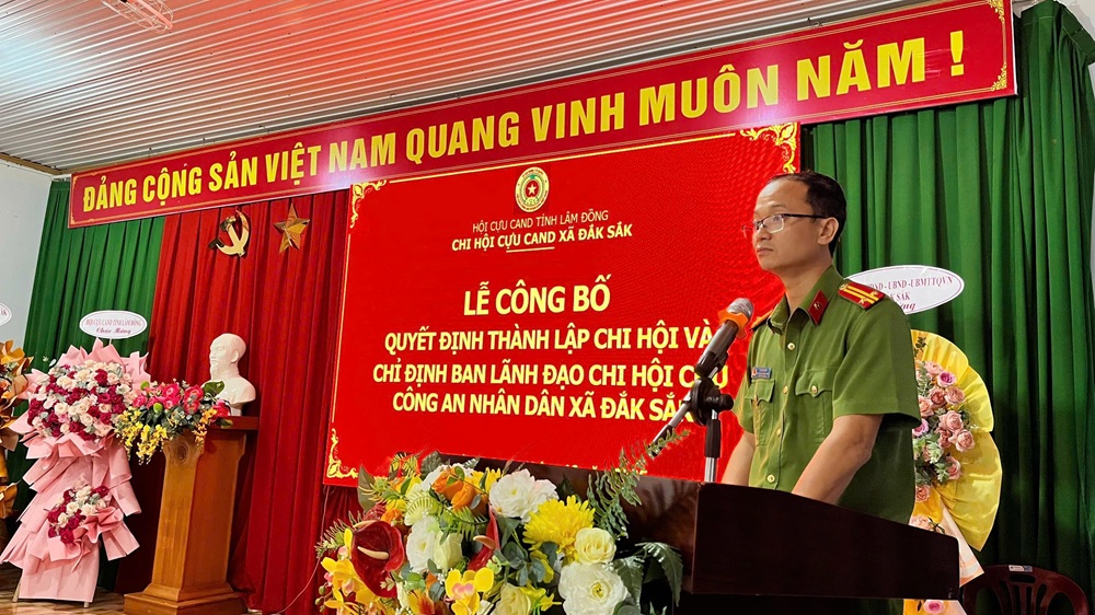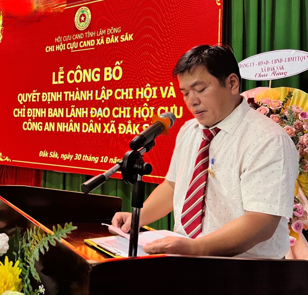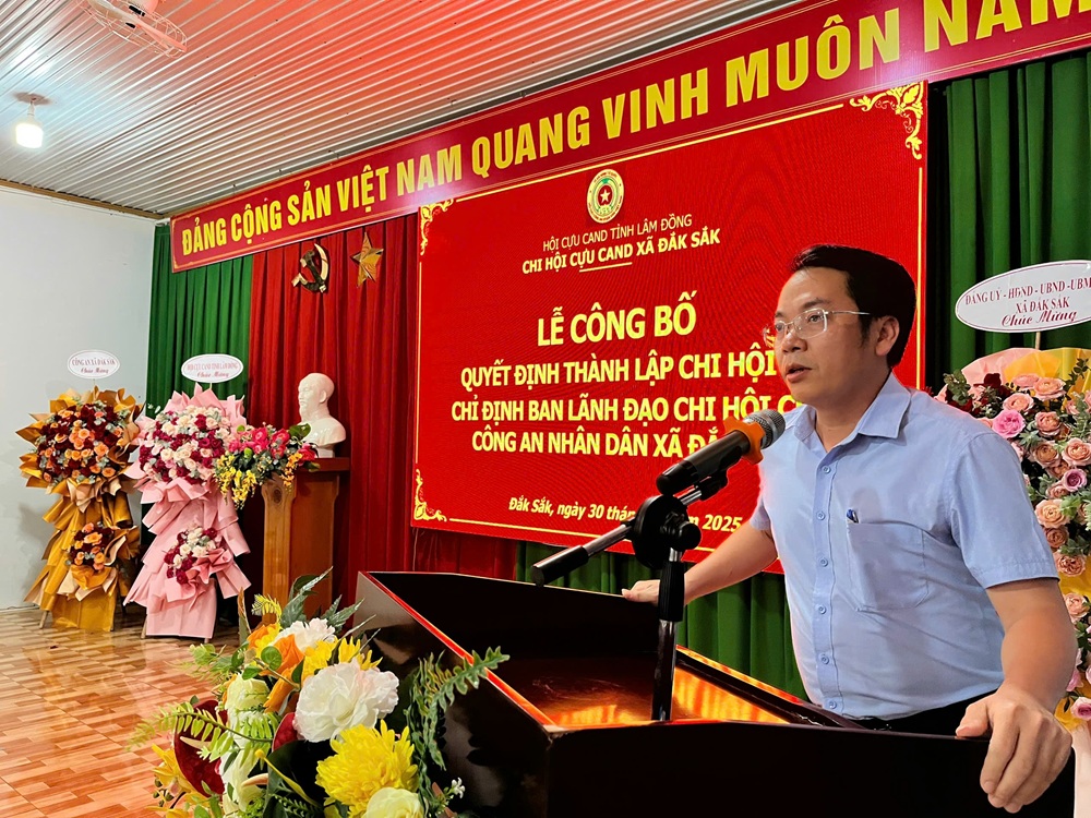 Tại buổi lễ, thừa ủy quyền của Ban Thường vụ Hội Cựu CAND tỉnh Lâm Đồng, đồng chí Đại tá Nguyễn Tường Thuật đã công bố Quyết định thành lập Chi hội Cựu CAND xã Đắk Sắk. Chi hội được thành lập trên cơ sở hợp nhất các Chi hội Cựu CAND đang hoạt động trên địa bàn, nhằm thống nhất về tổ chức và nâng cao hiệu quả hoạt động theo địa giới hành chính.