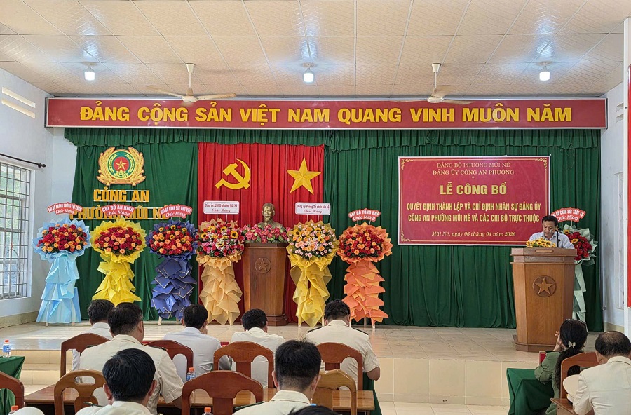 Phát biểu tại buổi lễ, đồng chí Phạm Văn Nam, Ủy viên Ban Thường vụ Tỉnh ủy, Bí thư Đảng ủy phường nhấn mạnh Mũi Né là địa bàn trọng điểm về du lịch, dịch vụ, tập trung đông dân cư và du khách, lực lượng Công an phường cần tiếp tục phát huy vai trò nòng cốt trong bảo đảm an ninh, trật tự, góp phần xây dựng địa bàn an toàn, văn minh, thân thiện; việc thành lập Đảng bộ Công an phường là yêu cầu tất yếu, đồng thời đề nghị Đảng bộ nhanh chóng ổn định tổ chức, phát huy vai trò hạt nhân chính trị, nâng cao chất lượng sinh hoạt Đảng, gắn xây dựng Đảng với xây dựng lực lượng chính quy, tinh nhuệ, hiện đại.