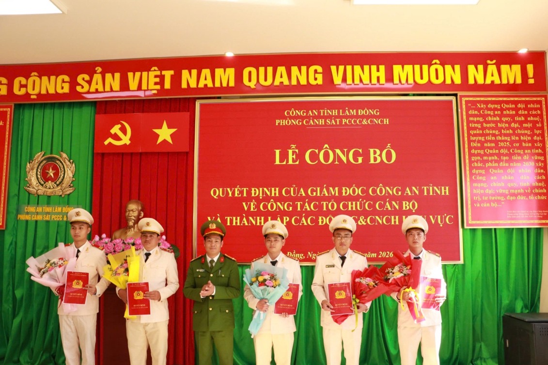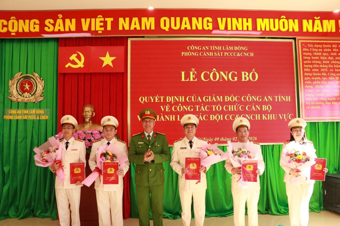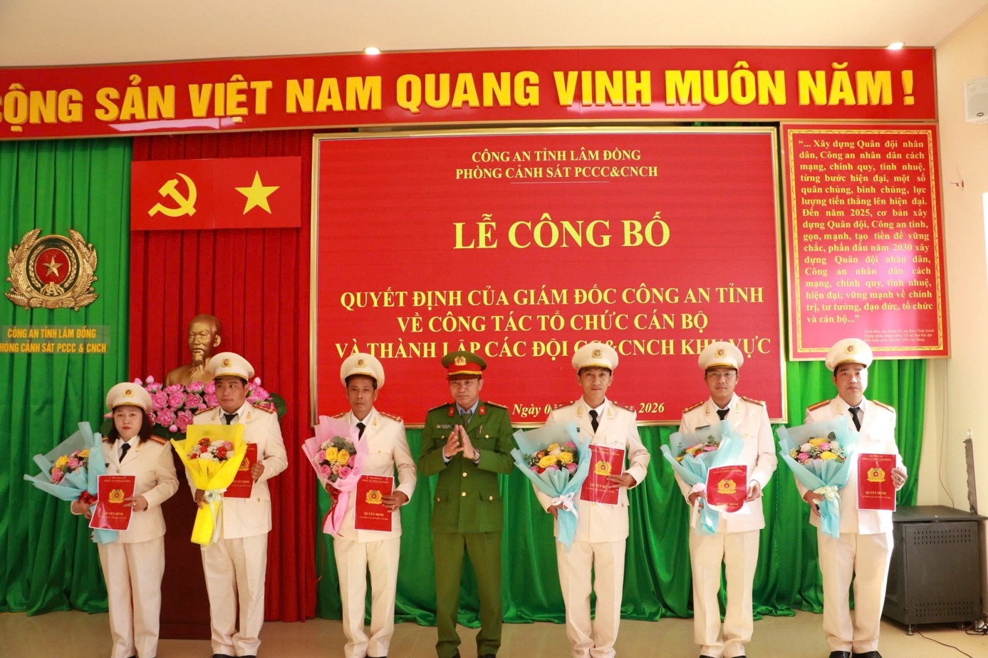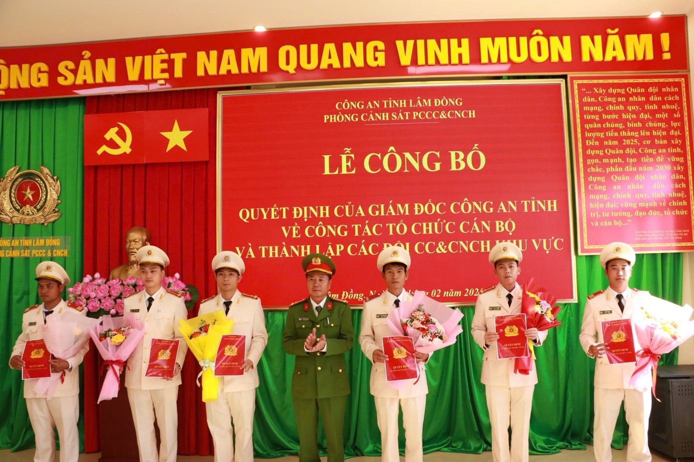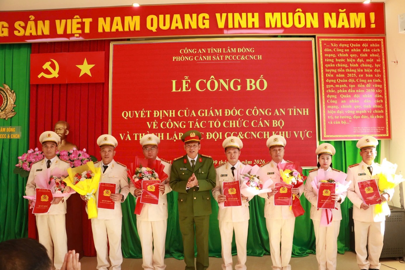 Thừa ủy quyền của Giám đốc Công an tỉnh, lãnh đạo Phòng Cảnh sát PCCC và CNCH đã trao quyết định cho các đồng chí được điều động, bổ nhiệm. Điểm nhấn quan trọng của buổi lễ là việc công bố thành lập và ra mắt 05 Đội Cảnh sát PCCC và CNCH khu vực mới (từ Đội khu vực 16 đến Đội khu vực 20). Đây là chủ trương nhằm mở rộng mạng lưới, nâng cao khả năng ứng phó nhanh và hiệu quả công tác cứu nạn, cứu hộ tại cơ sở.
