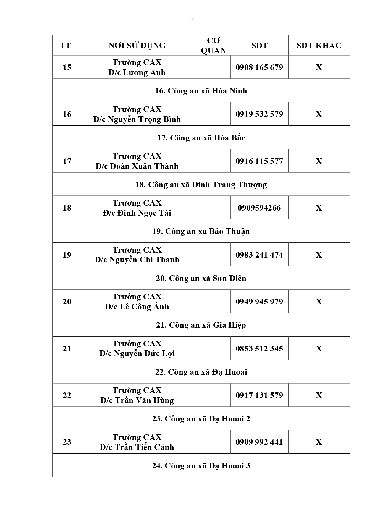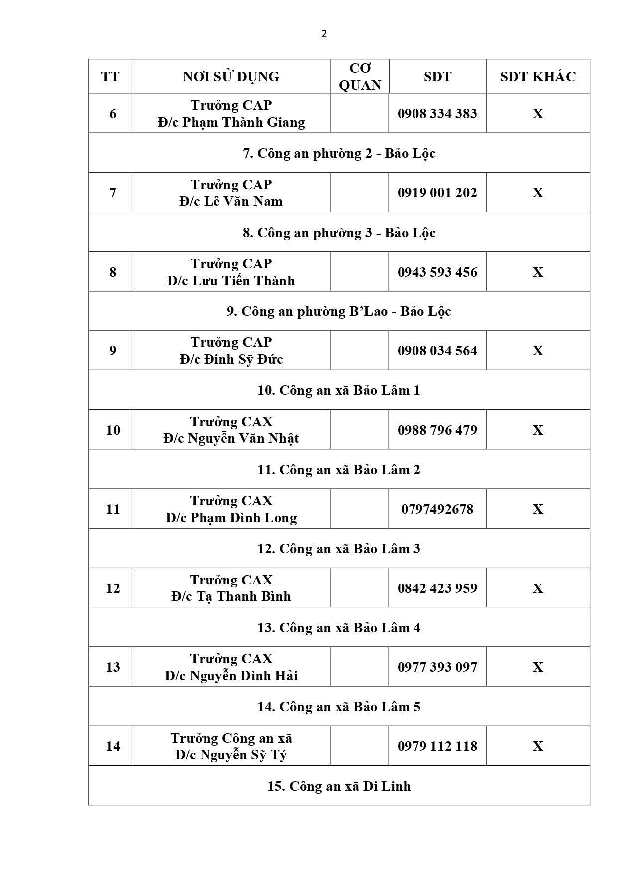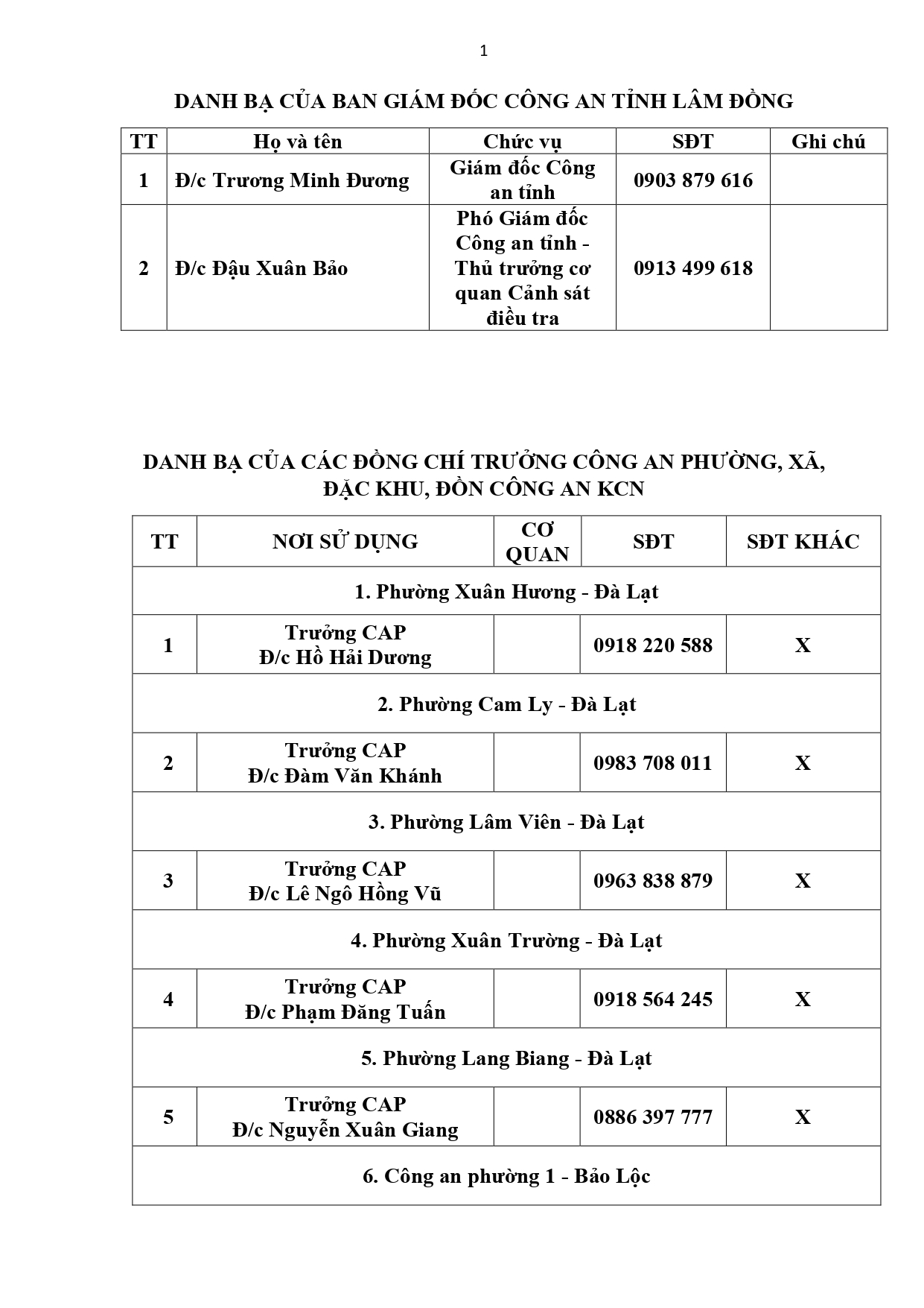 Thông báo Công bố số điện thoại đường dây nóng phục vụ công tác tiếp nhận, giải quyết đối với các vụ việc vi phạm pháp luật về ma tuý Your browser does not support the audio element.   19/12/2025 15:02 |   129 |  Thực hiện ý kiến chỉ đạo của Lãnh đạo Công an tỉnh Lâm Đồng về việc công bố danh sách số điện thoại của đồng chí Giám đốc, Phó Giám đốc, Trưởng phòng Cảnh sát điều tra tội phạm về ma tuý và Trưởng Công an cấp xã để kịp thời tiếp nhận, xử lý tố giác, tin báo và các thông tin phản ánh của người dân liên quan đến công tác phòng ngừa, đấu tranh với tội phạm về ma tuý, Trang thông tin điện tử Công an tỉnh đăng tải danh sách số điện thoại đến toàn thể Nhân dân để kịp thời tố giác tội phạm và các hành vi vi phạm pháp luật về ma tuý: Ban Biên tập Từ khóa Liên kết Danh bạ đường dây nóng phòng chống tội phạm