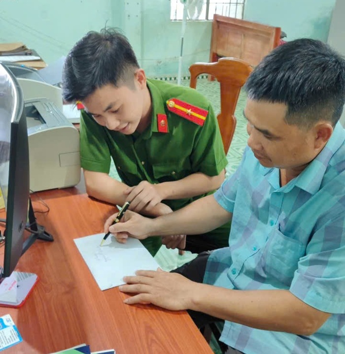 Cán bộ Công an xã tiếp nhận thông tin của người nhặt được tiềna