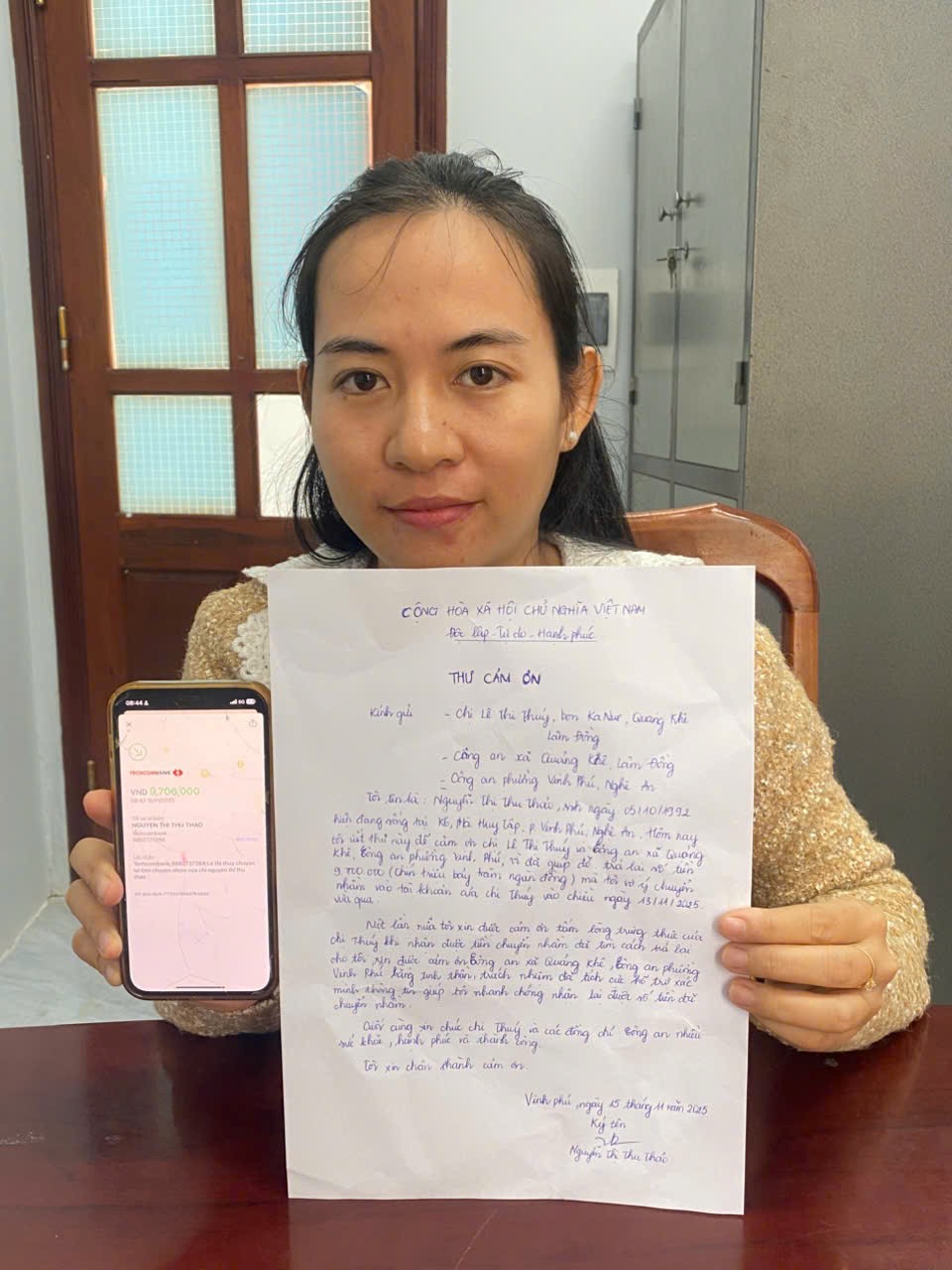Tại cơ quan Công an, chị Thảo xúc động gửi lời cảm ơn đến chị Thuý và lực lượng Công an vì tinh thần trách nhiệm và sự hỗ trợ kịp thời.