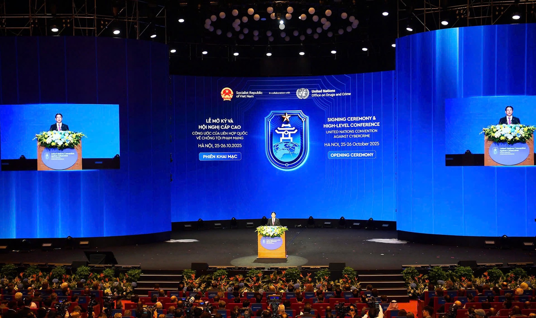 Phát biểu tại Lễ mở ký, thay mặt cho Nhà nước và Nhân dân Việt Nam, Chủ tịch nước Lương Cường nhiệt liệt chào mừng các đại biểu đến với Thủ đô Hà Nội - Thành phố vì Hòa bình, để tham dự Lễ mở ký Công ước Liên hợp quốc về chống tội phạm mạng - một sự kiện mang ý nghĩa lịch sử, khởi đầu cho kỷ nguyên hợp tác toàn cầu về không gian mạng.