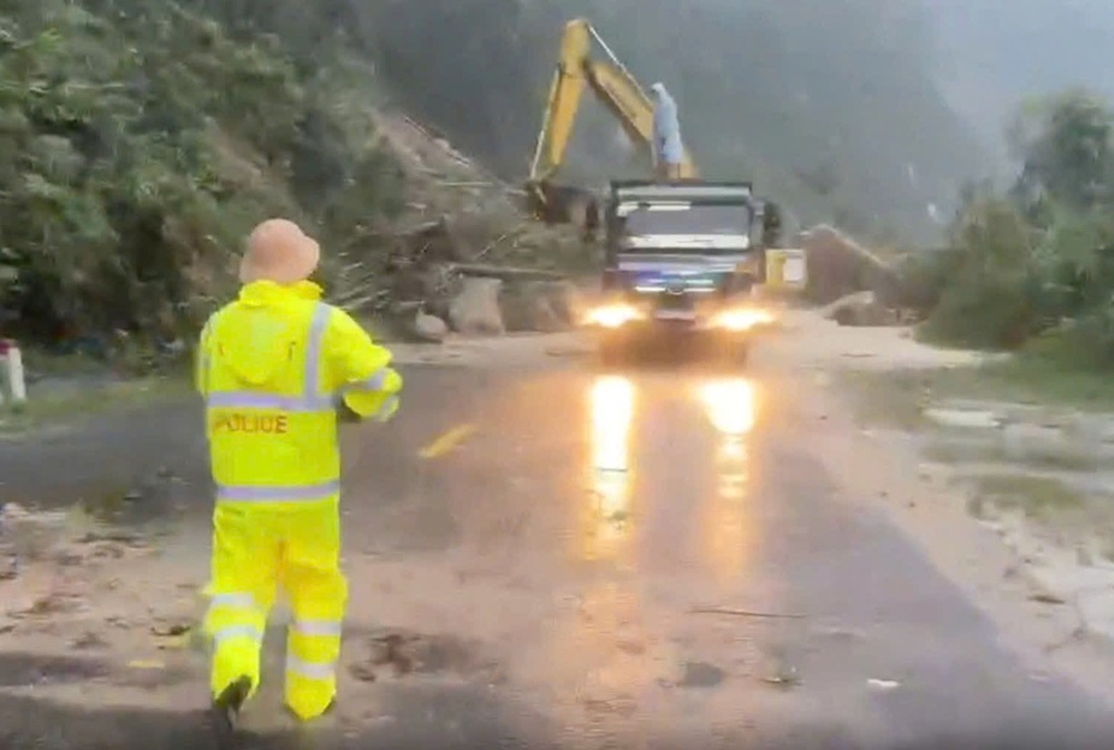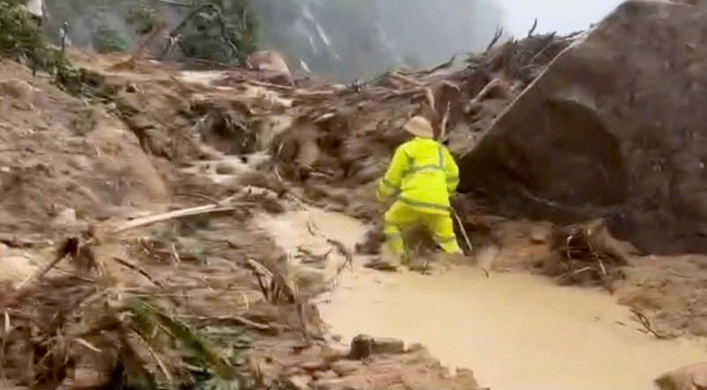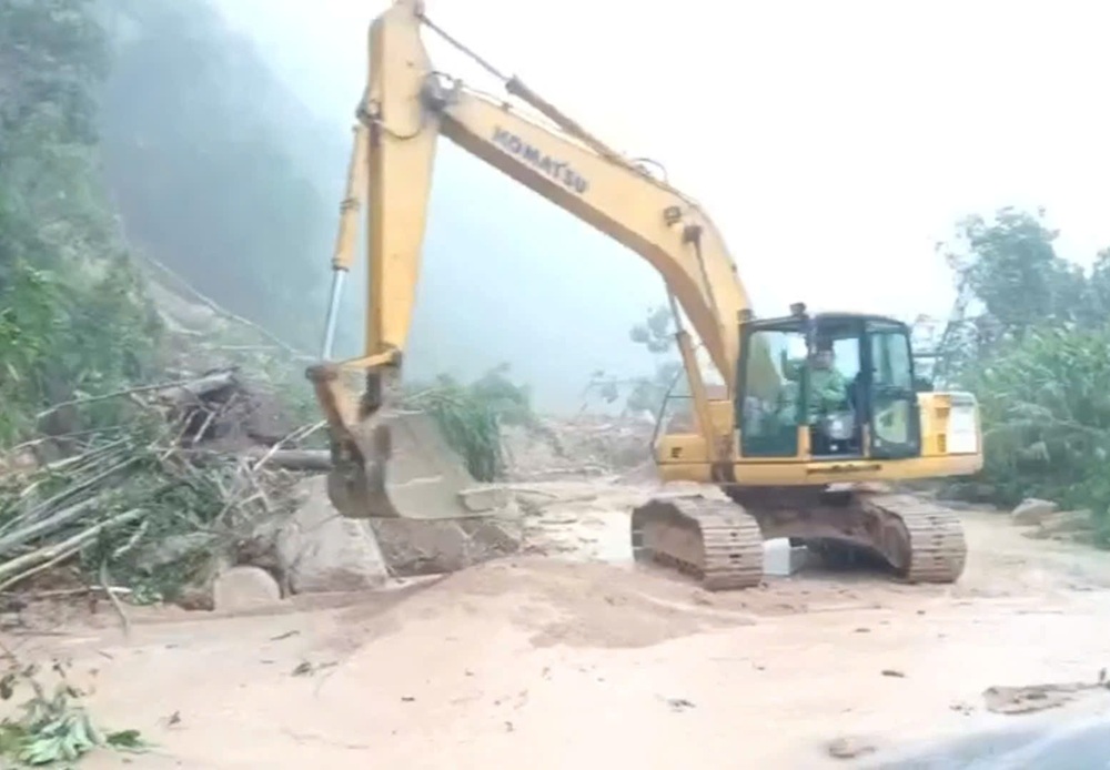 Lực lượng chức năng đang nỗ lực dọn dẹp đoạn đường bị sạt lở