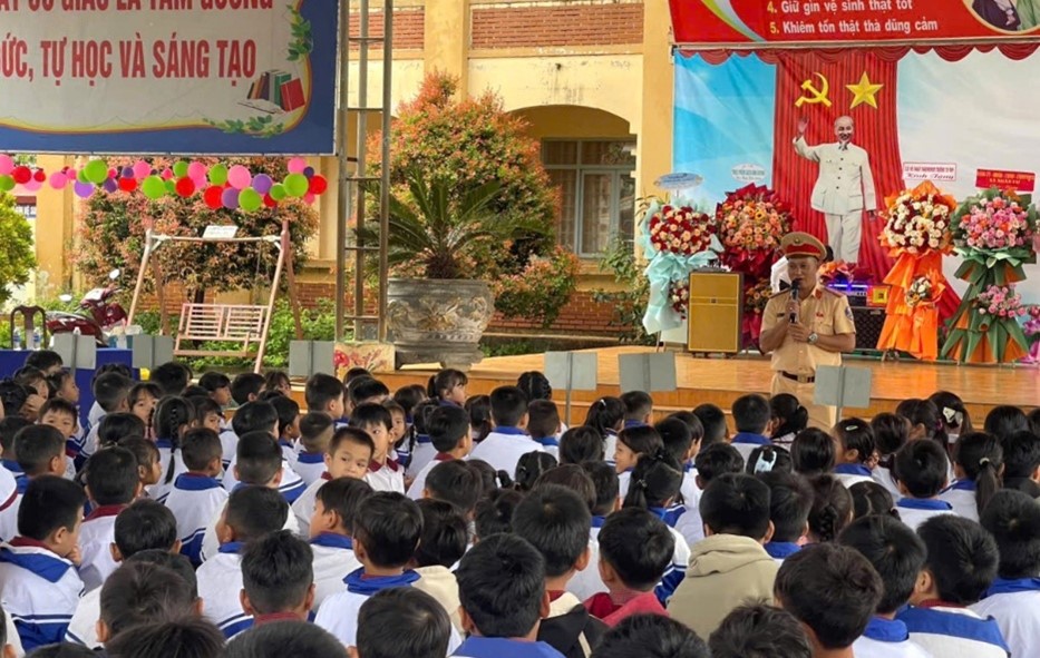 Lực lượng CSGT tuyên truyền cho các em học sinh trường tiểu học Phan Đình Phùng, xã Nhân Cơ.