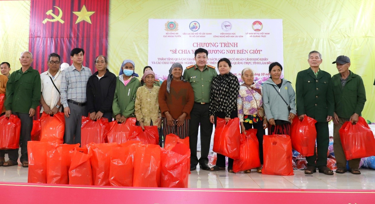 Lãnh đạo Cục Ngoại tuyến – Bộ Công an và chính quyền xã Quảng Trực trao quà cho các hộ gia đình chính sách, gia đình có hoàn cảnh khó khăn
