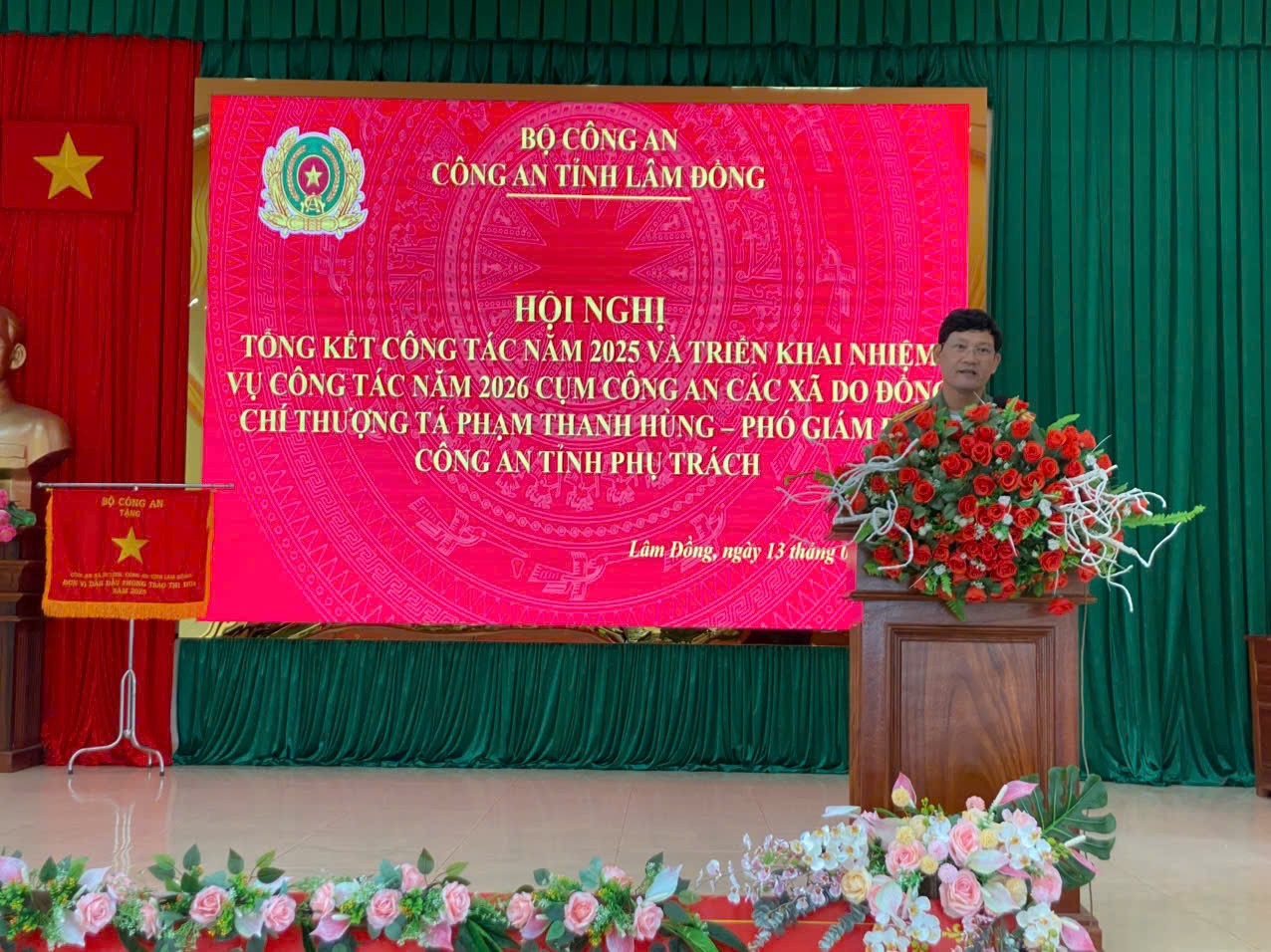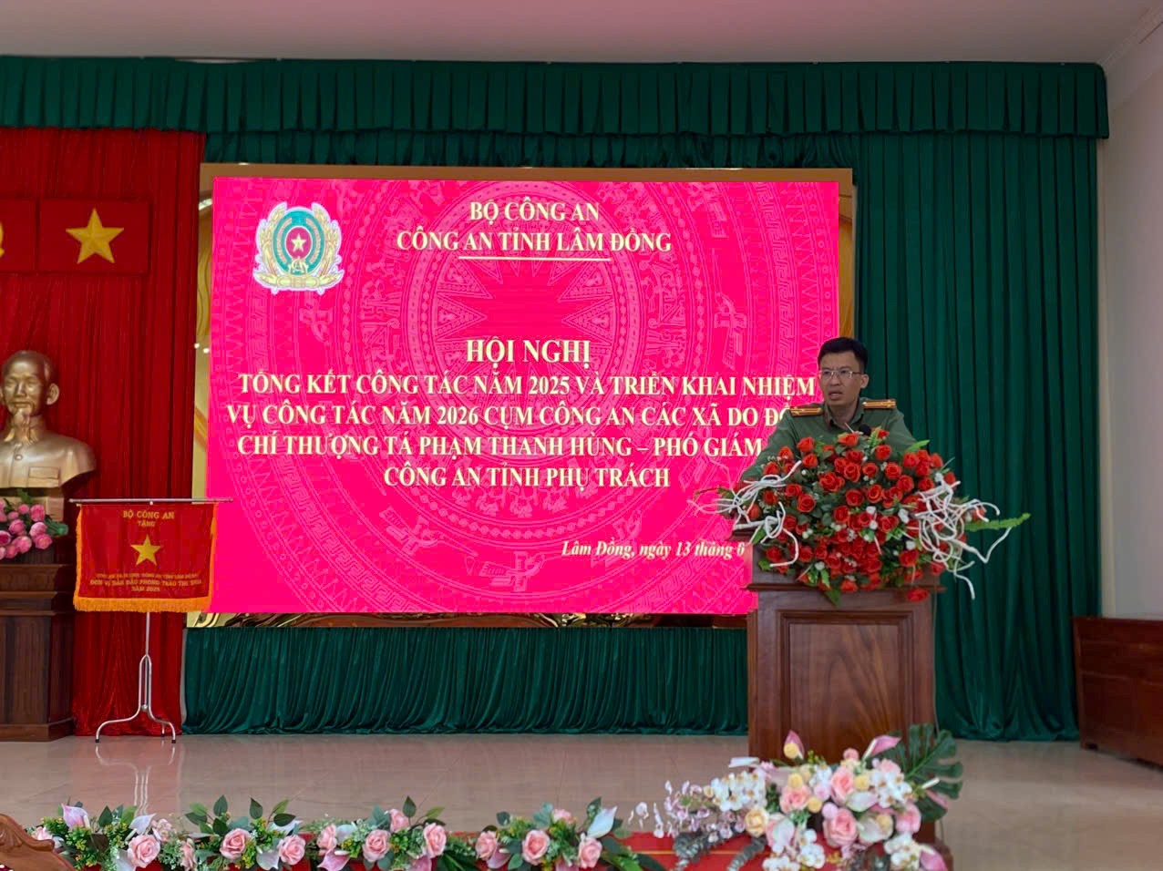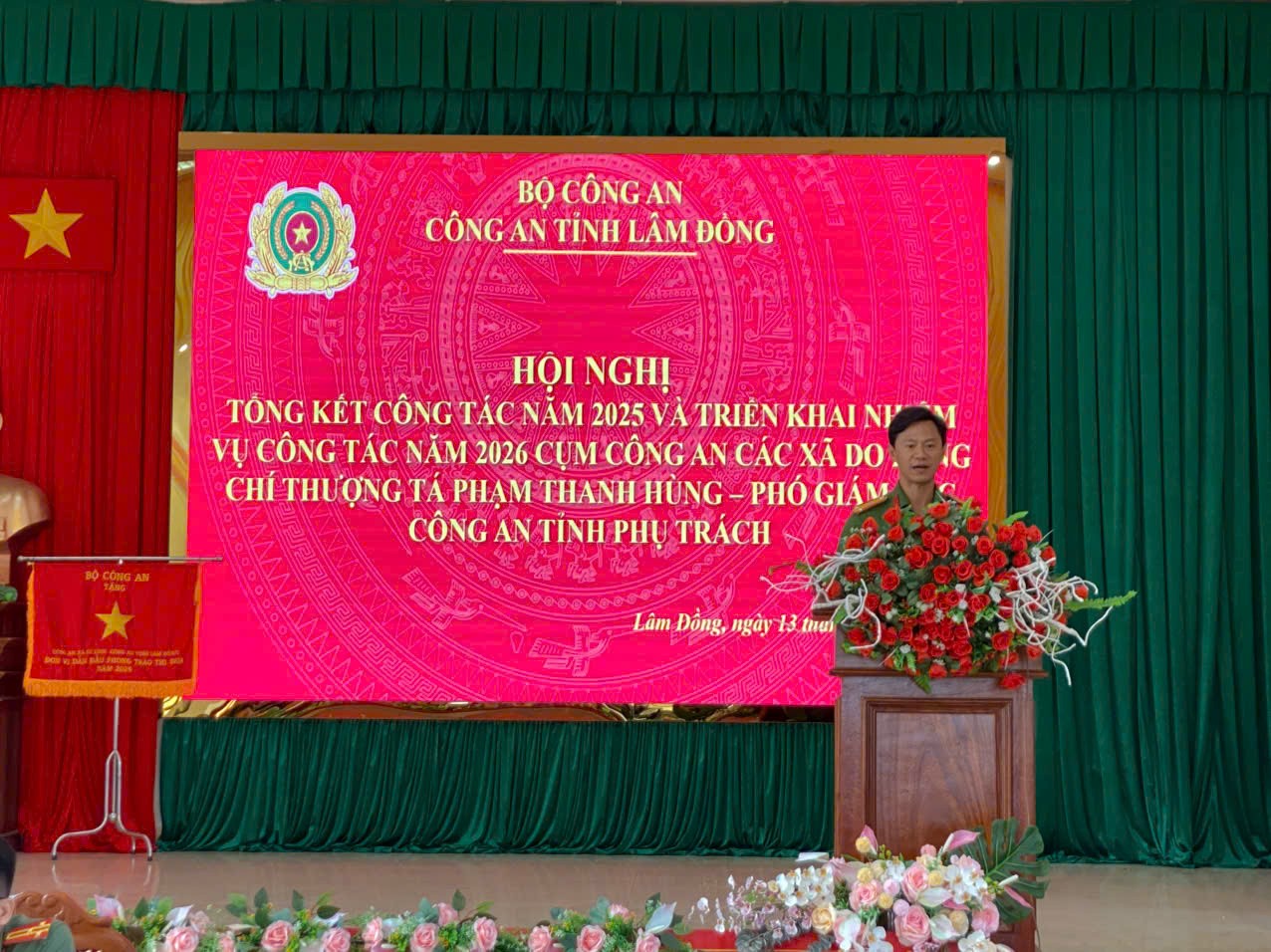 Phát biểu chỉ đạo tại Hội nghị, đồng chí Thượng tá Phạm Thanh Hùng ghi nhận, biểu dương những kết quả, thành tích mà Công an 07 xã trong Cụm đã đạt được trong năm 2025. Đồng chí yêu cầu các đơn vị tiếp tục chú trọng công tác xây dựng Đảng, xây dựng lực lượng; trọng tâm là đẩy mạnh giáo dục chính trị, tư tưởng cho cán bộ, chiến sĩ; siết chặt kỷ luật, kỷ cương, điều lệnh Công an nhân dân. Đồng thời, tăng cường nắm tình hình, nâng cao chất lượng công tác nghiệp vụ cơ bản; triển khai đồng bộ các biện pháp bảo đảm an ninh quốc gia, phòng ngừa, đấu tranh hiệu quả với các loại tội phạm và tệ nạn xã hội.