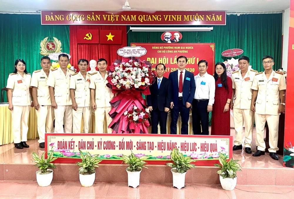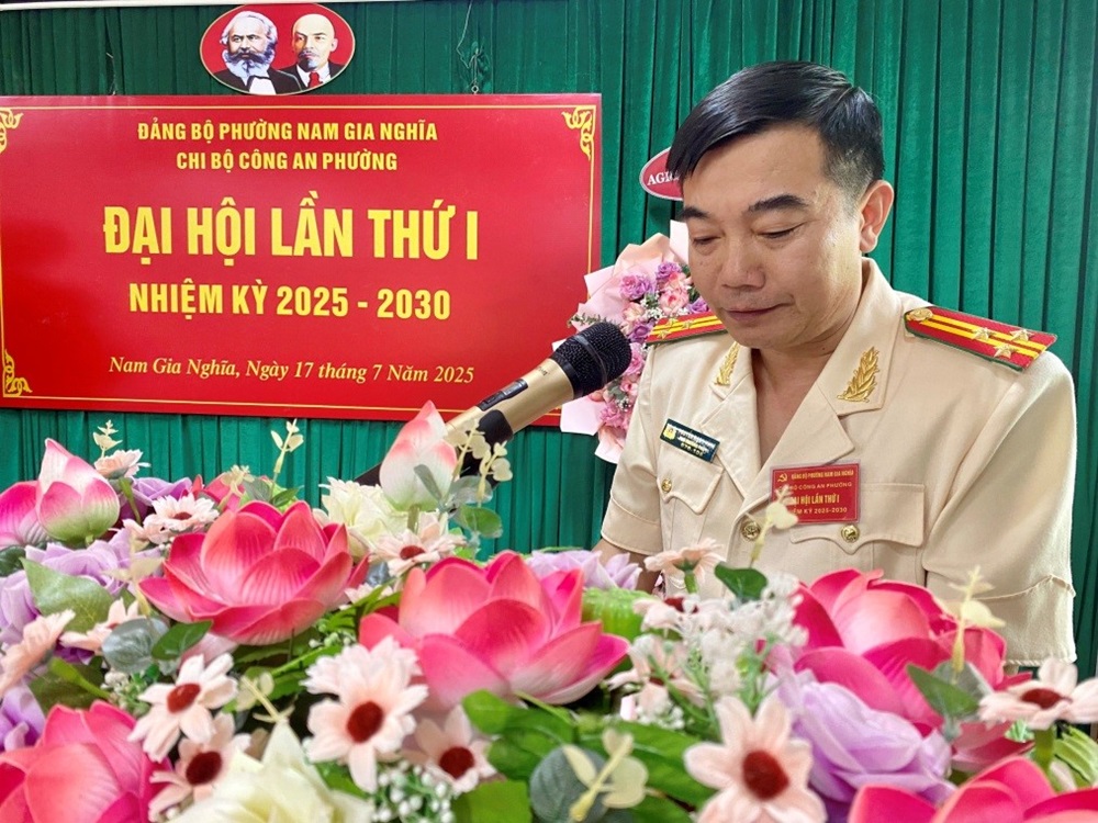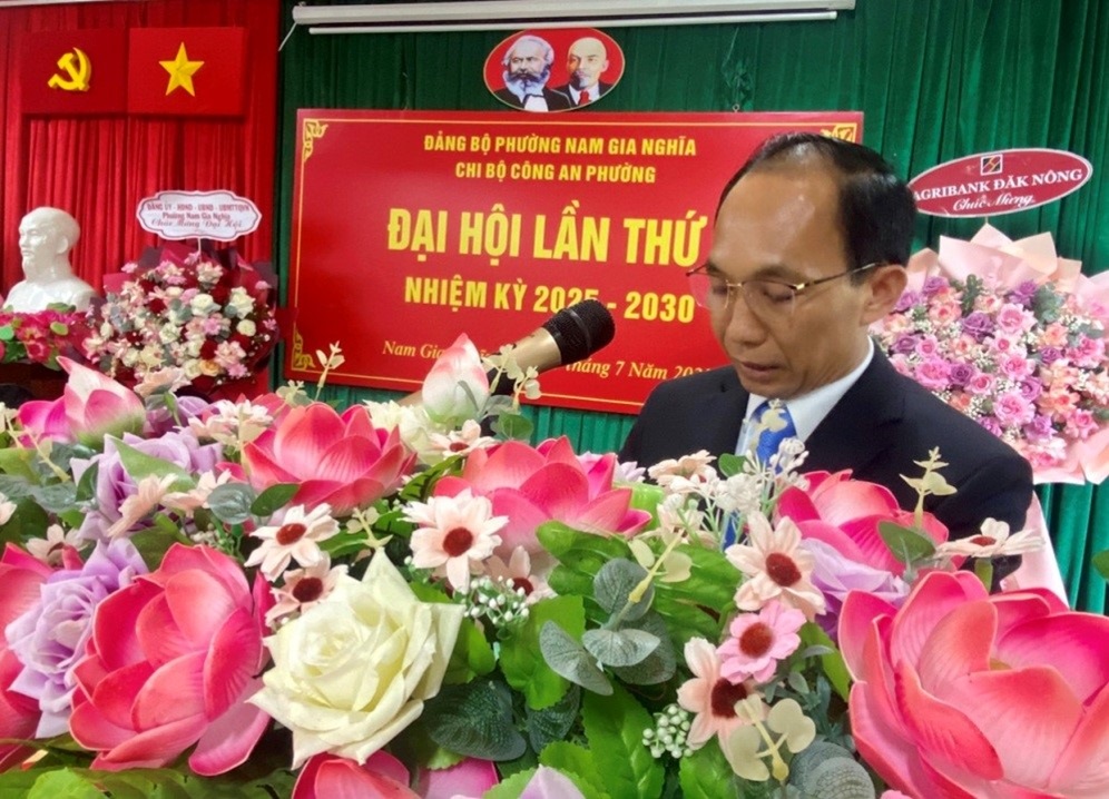 Phát biểu chỉ đạo tại Đại hội, Đồng chí Phan Văn Quốc, Phó Bí thư Đảng ủy, Chủ tịch UBND phường Nam Gia Nghĩa đã ghi nhận và đánh giá cao sự nỗ lực cố gắng của các đồng chí Bí thư, Phó Bí thư, cấp uỷ viên và các đảng viên trong Chi bộ đã tích cực chuẩn bị về mọi mặt để tổ chức Đại hội; biểu dương những thành tích, kết quả mà chi bộ đạt được trong nhiệm kỳ vừa qua. Đồng chí đề nghị, trong thời gian tới, mọi hoạt động của lực lượng Công an phải bám sát sự lãnh đạo, chỉ đạo của Đảng, của Nhà nước, phục vụ có hiệu quả các nhiệm vụ phát triển kinh tế, xã hội, bảo đảm quốc phòng, an ninh của địa phương. Tiếp tục thực hiện Nghị quyết đại hội đảng các cấp đối với công an nhân dân. Tham mưu cho cấp ủy, chính quyền chỉ đạo thực hiện tốt công tác ANQP và đảm bảo ANCT TTATXH. Bảo đảm an toàn tuyệt đối các sự kiện chính trị quan trọng của địa phương. Giữ vững an ninh trật tự, bảo đảm trật tự an toàn xã hội trong mọi tình huống; tuyệt đối không chủ quan, lơ là; không để bị động, bất ngờ. Chủ động dự báo sớm, đánh giá đúng tình hình; nhận diện rõ các nguy cơ, mối đe doạ đến an ninh chính trị, trật tự, an toàn xã hội ở địa phương; Tăng cường công tác tuyên truyền trong nhân dân nâng cao ý thức cảnh giác phòng chống tội phạm.