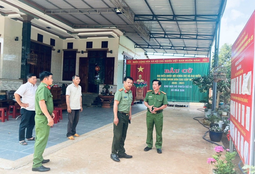 Đồng chí Đại tá Nay Gia Phú – Phó Giám đốc Công an tỉnh trực tiếp kiểm tra công tác chuẩn bị bầu cử tại khu vực bỏ phiếu số 17, xã Đắk Sắk