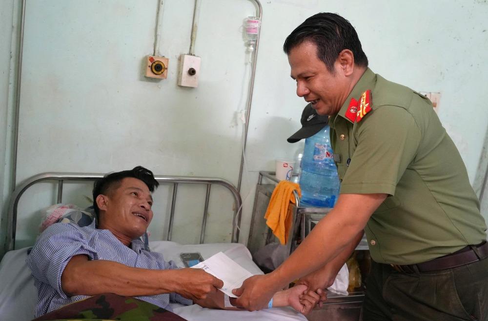 Tại đây, Đại tá Nay Gia Phú ân cần thăm hỏi tình hình sức khỏe, động viên đồng chí Hiệp yên tâm điều trị, sớm bình phục để trở lại công tác, phục vụ Nhân dân. Đồng chí Phó Giám đốc ghi nhận, biểu dương tinh thần trách nhiệm, không quản hiểm nguy của Trung tá Đinh Quốc Hiệp trong công tác giữ gìn an ninh trật tự ở cơ sở.