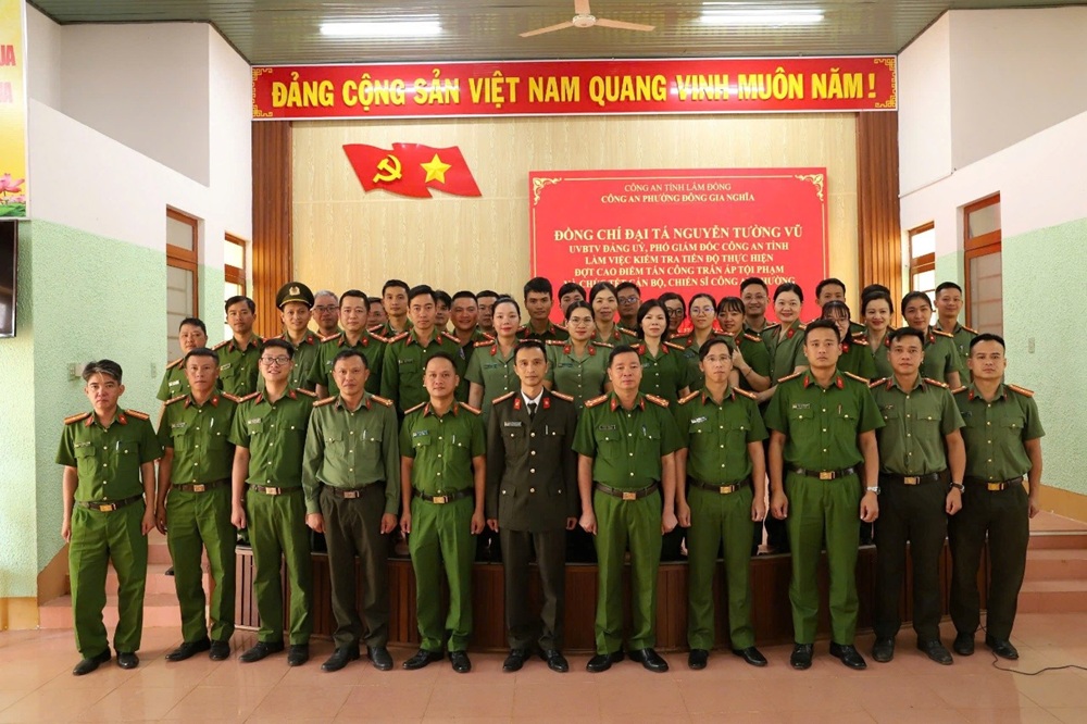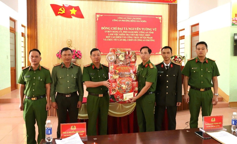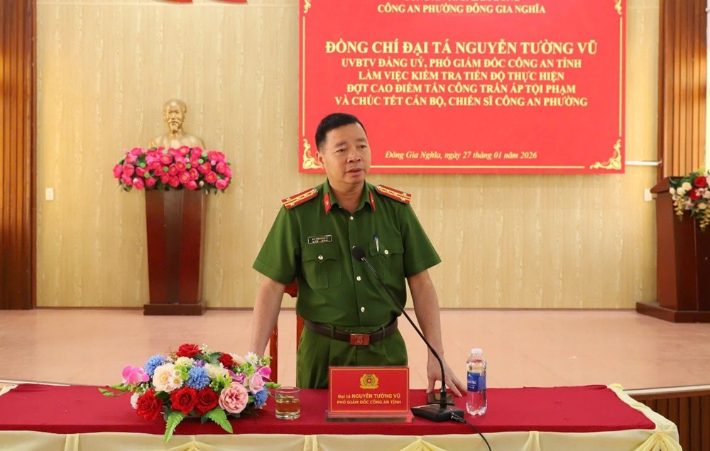 Tại Công an phường Đông Gia Nghĩa, Đoàn công tác đã kiểm tra tiến độ thực hiện đợt cao điểm tấn công, trấn áp tội phạm và thăm, chúc Tết cán bộ, chiến sĩ. Lãnh đạo Công an phường báo cáo kết quả công tác năm 2025 và tình hình an ninh, trật tự trên địa bàn đầu năm 2026. Phát biểu tại buổi làm việc, Đại tá Nguyễn Tường Vũ ghi nhận, biểu dương tinh thần trách nhiệm, sự nỗ lực của tập thể cán bộ, chiến sĩ Công an phường trong công tác giữ gìn an ninh, trật tự. Đồng chí Phó Giám đốc Công an tỉnh gửi lời chúc mừng năm mới, đồng thời đề nghị đơn vị tiếp tục tăng cường nắm tình hình địa bàn, tổ chức tuần tra kiểm soát, bảo đảm an ninh, an toàn cho Nhân dân trong dịp Tết Nguyên đán.