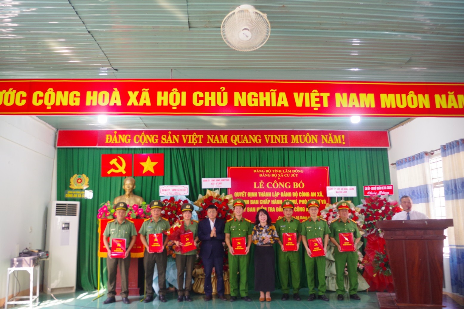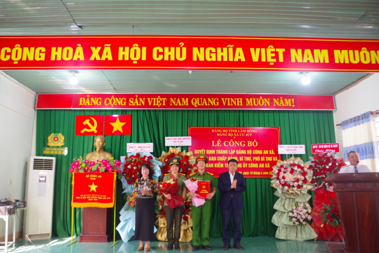 Đồng chí Nghiêm Hồng Quang – Bí thư Đảng ủy, Chủ tịch HĐND xã cùng đồng chí Nguyễn Thị Hương – Phó Bí thư Thường trực Đảng ủy xã trao Quyết định thành lập Đảng bộ Công an xã Cư Jút, quyết định cho Ban Chấp hành Đảng bộ Công an xã và quyết định cho Ủy ban Kiểm tra Đảng ủy Công an xã Cư Jút.