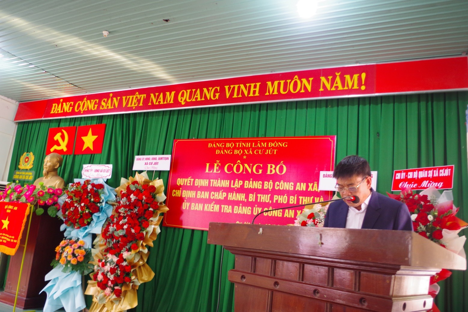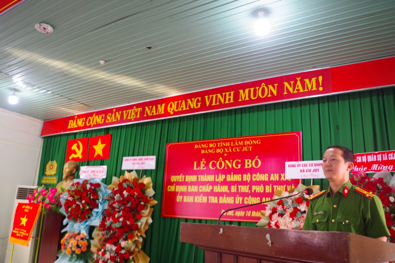 Tại buổi lễ, Ban Xây dựng Đảng ủy xã đã công bố các quyết định về việc thành lập Đảng bộ Công an xã Cư Jút nhiệm kỳ 2025 – 2030 với tổng số 78 đảng viên; đồng thời chỉ định Ban Chấp hành, Ủy ban Kiểm tra, Bí thư và Phó Bí thư Đảng ủy. Theo đó, đồng chí Nguyễn Sử – Ủy viên Ban Thường vụ Đảng ủy, Trưởng Công an xã được chỉ định giữ chức vụ Bí thư Đảng ủy Công an xã; đồng chí Kim Thị Tuyết – Ủy viên Ban Chấp hành Đảng ủy, Phó Trưởng Công an xã được chỉ định giữ chức vụ Phó Bí thư Đảng ủy Công an xã. Đây không chỉ là sự kiện mang tính tổ chức mà còn là dấu mốc thể hiện rõ quyết tâm xây dựng lực lượng Công an xã chính quy, tinh nhuệ, đủ năng lực đáp ứng yêu cầu nhiệm vụ trong tình hình mới.