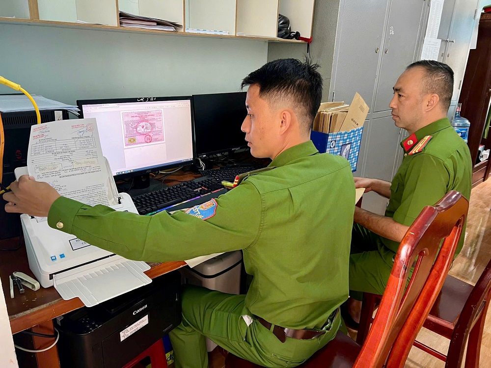 Lực lượng Công an xã đang số hóa hồ sơ phương tiện