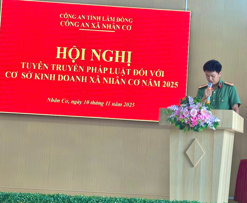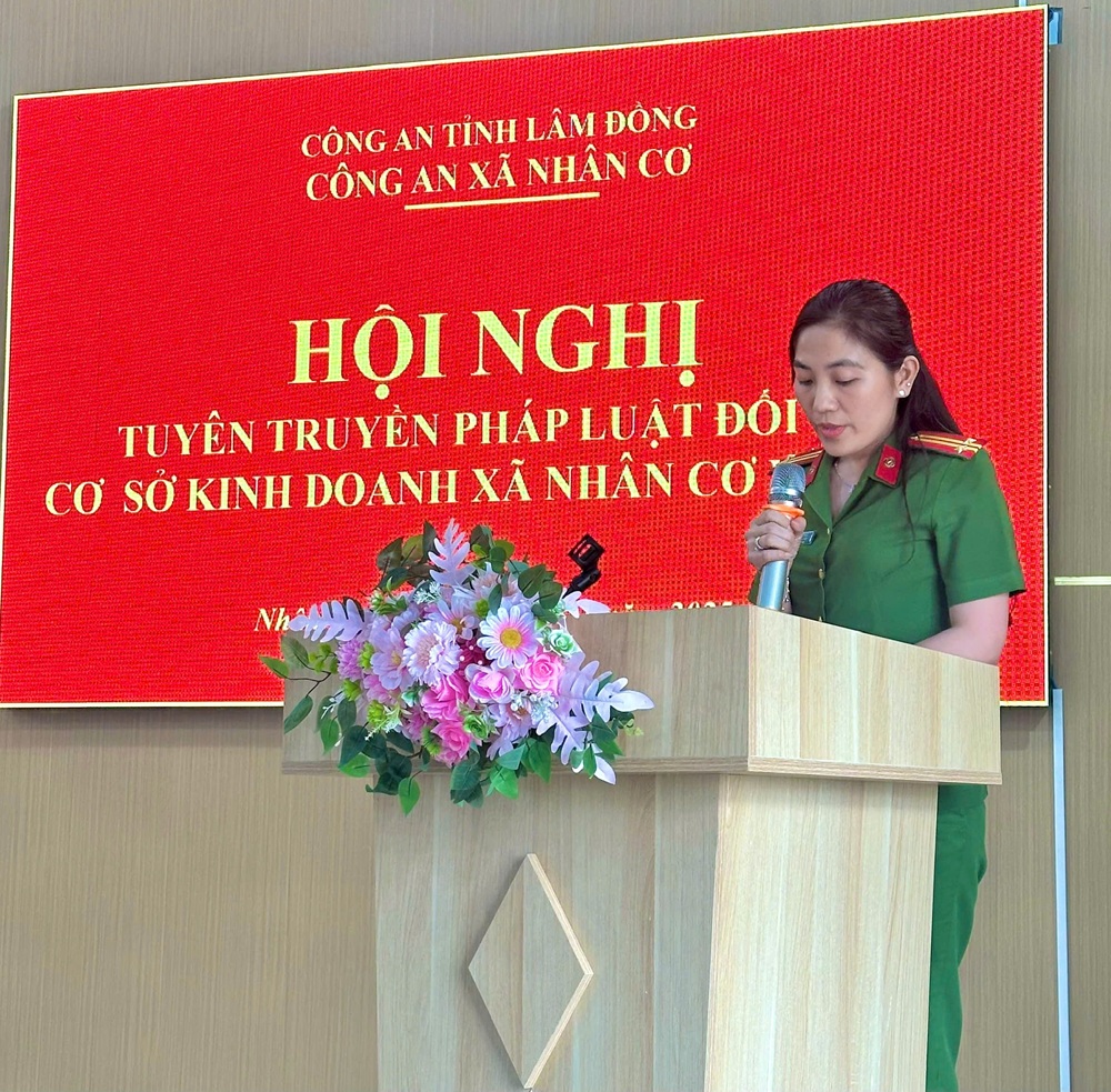 Phát biểu tại Hội nghị, Thượng tá Đỗ Văn Kiên – Trưởng Công an xã Nhân Cơ nhấn mạnh: việc tuyên truyền, phổ biến pháp luật cho các cơ sở kinh doanh là nhiệm vụ quan trọng, góp phần nâng cao nhận thức, ý thức chấp hành pháp luật, phòng ngừa vi phạm, đảm bảo an ninh, trật tự, an toàn xã hội trong giai đoạn hiện nay. Đặc biệt là đối với các ngành nghề kinh doanh có điều kiện về an ninh, trật tự như: nhà nghỉ, karaoke, bi-da, dịch vụ cầm đồ, internet, ăn uống, massage, nhà trọ, vận tải, kinh doanh xăng dầu, khí hóa lỏng…