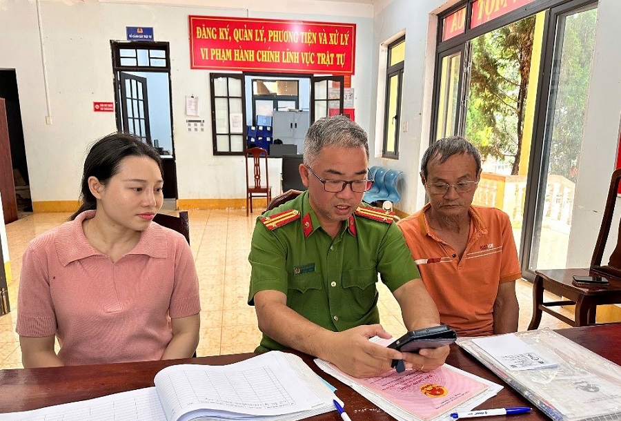 Cán bộ Công an phường hướng dẫn người dân cài đặt ứng dụng tại bộ phận giải quyết thủ tục hành chính