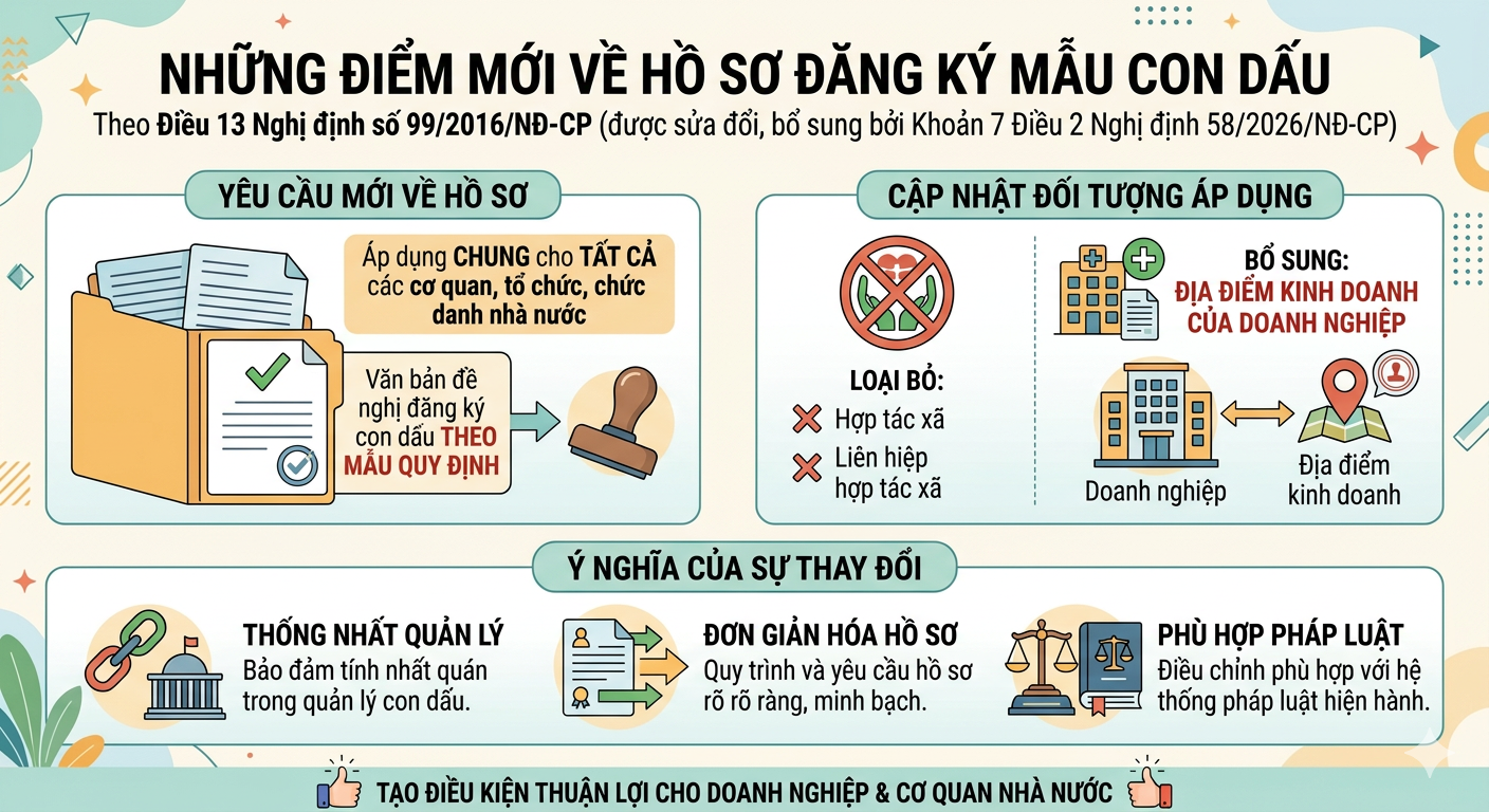 Nghị định 58/2026/NĐ-CP sửa đổi, bổ sung quy định về hồ sơ đăng ký mẫu con dấu tại Điều 13 Nghị định số 99/2016/NĐ-CP về quản lý và sử dụng con dấu.