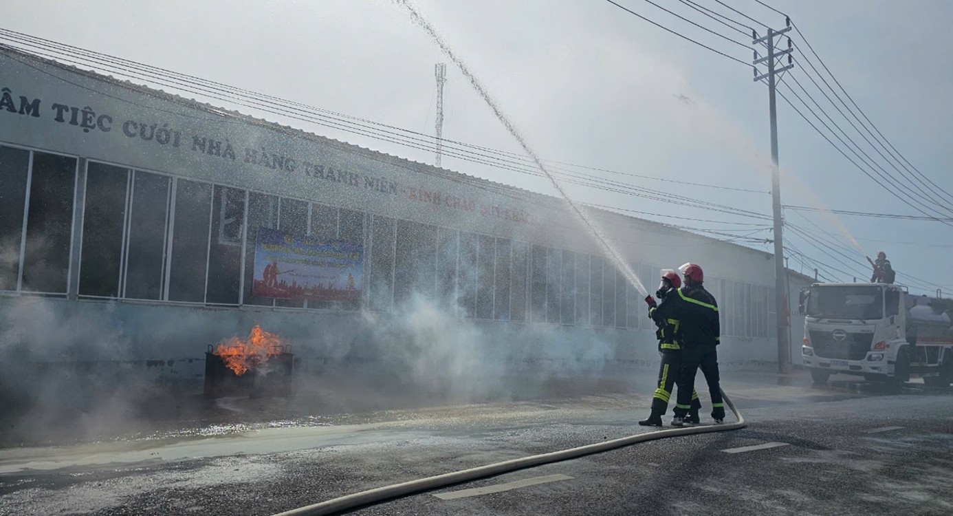 Tình huống giả định được đặt ra là xảy ra cháy tại khu vực bếp của cơ sở do không chấp hành nghiêm các quy định về sử dụng nguồn nhiệt, nguồn lửa; thời điểm xảy ra cháy có nhiều người đang làm việc tại cơ sở. Ngay khi phát hiện sự cố, lực lượng PCCC cơ sở đã nhanh chóng báo động, kích hoạt hệ thống báo cháy, cắt điện khu vực xảy ra cháy, sử dụng phương tiện chữa cháy tại chỗ để khống chế đám cháy ban đầu và báo cháy qua số điện thoại khẩn cấp 114.