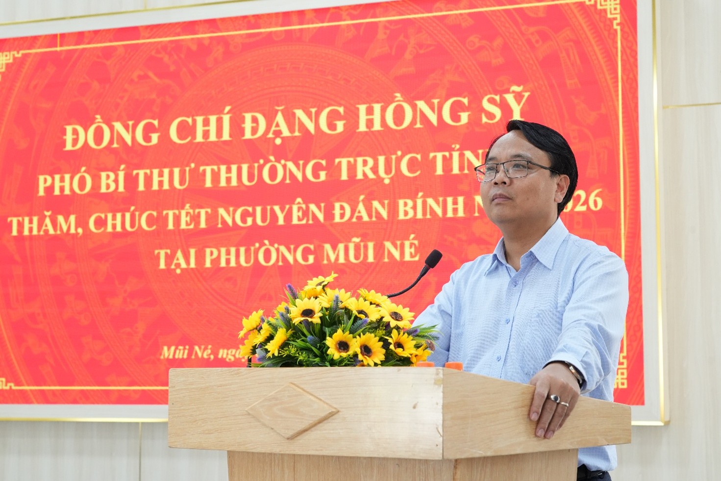 Tiếp đến, Đoàn công tác đã đến thăm, tặng quà Tết tại phường Mũi Né, địa bàn đang tập trung triển khai nhiều hoạt động phục vụ Nhân dân và du khách vui Xuân, đón Tết. Đồng chí Phó Bí thư Thường trực Tỉnh ủy gửi lời chúc Tết tới cán bộ và Nhân dân địa phương; đồng thời đề nghị địa phương tiếp tục giữ vững an ninh, trật tự, chủ động phòng ngừa, đấu tranh, bài trừ các loại tệ nạn xã hội, tuyệt đối không để xảy ra vi phạm về pháo nổ, bảo đảm môi trường du lịch an toàn, văn minh.