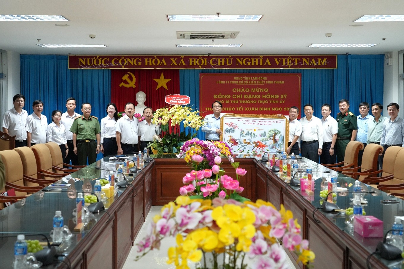 Đến thăm Công ty TNHH Xổ số kiến thiết Bình Thuận, Đoàn công tác đã nghe báo cáo về tình hình sản xuất, kinh doanh và những đóng góp cho ngân sách địa phương. Năm 2025, doanh thu của công ty đạt hơn 7.200 tỷ đồng, lợi nhuận gần 1.000 tỷ đồng, nộp ngân sách hơn 2.600 tỷ đồng. Đặc biệt, trong năm 2025, đơn vị đã dành hơn 10 tỷ đồng cho các hoạt động an sinh xã hội, hỗ trợ xây dựng nhà đại đoàn kết, giáo dục và công tác thiện nguyện. Đồng chí Đặng Hồng Sỹ đánh giá cao những đóng góp thiết thực của doanh nghiệp, đồng thời đề nghị tiếp tục phát huy hiệu quả hoạt động, đồng hành cùng địa phương trong công tác chăm lo đời sống Nhân dân.