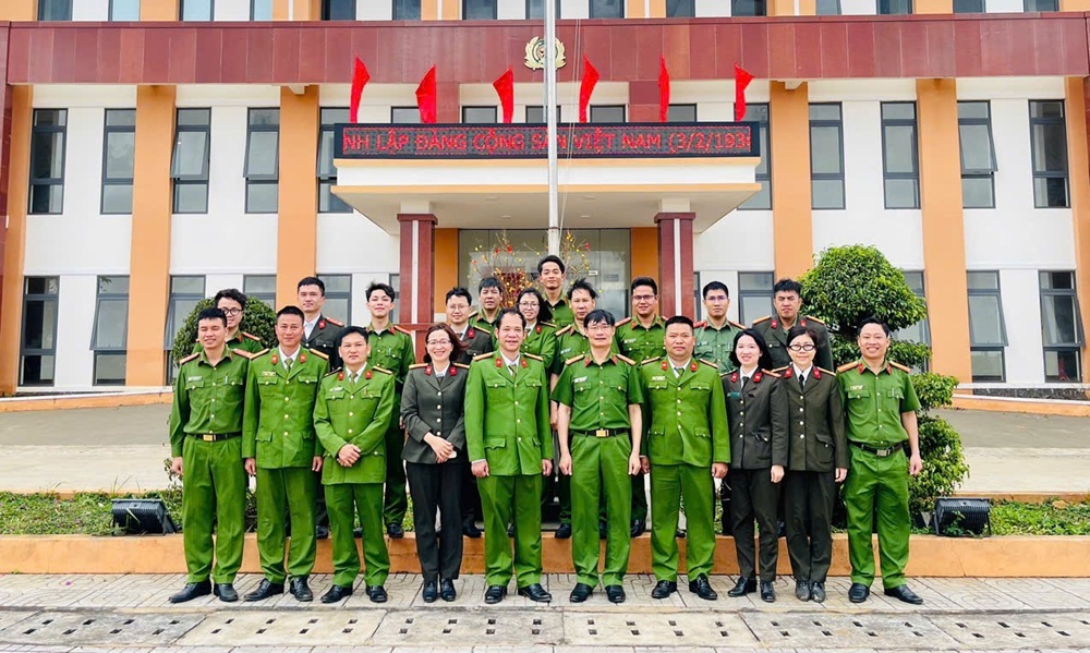 Đồng chí Phó Giám đốc chụp hình lưu niệm cùng tập thể chỉ huy, cán bộ chiến sĩ Công an xã Thuận An